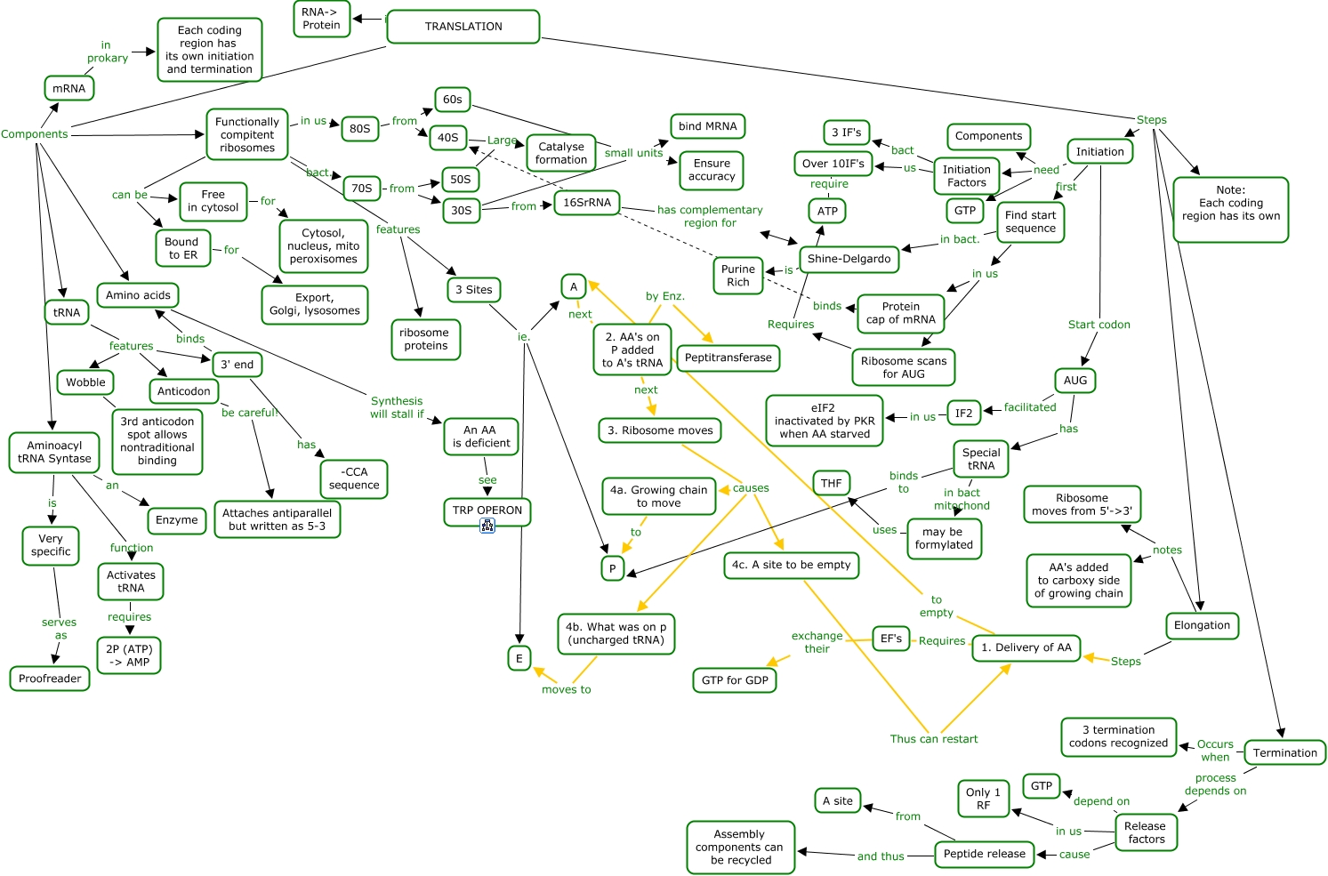 This Concept Map, created with IHMC CmapTools, has information related to: Translation outline, TRANSLATION ie. RNA-> Protein, Elongation Steps 1. Delivery of AA, Shine-Delgardo is Purine Rich, Ribosome scans for AUG Requires ATP, IF2 in us eIF2 inactivated by PKR when AA starved, 3' end binds Amino acids, Anticodon be careful! Attaches antiparallel but written as 5-3, Peptide release from A site, Free in cytosol for Cytosol, nucleus, mito peroxisomes, Bound to ER for Export, Golgi, lysosomes, Initiation need Components, Functionally compitent ribosomes can be Bound to ER, Termination process depends on Release factors, TRANSLATION Components Functionally compitent ribosomes, tRNA features 3' end, Initiation Start codon AUG, Protein cap of mRNA binds 40S, 4a. Growing chain to move to P, 80S from 40S, 3. Ribosome moves causes 4c. A site to be empty
