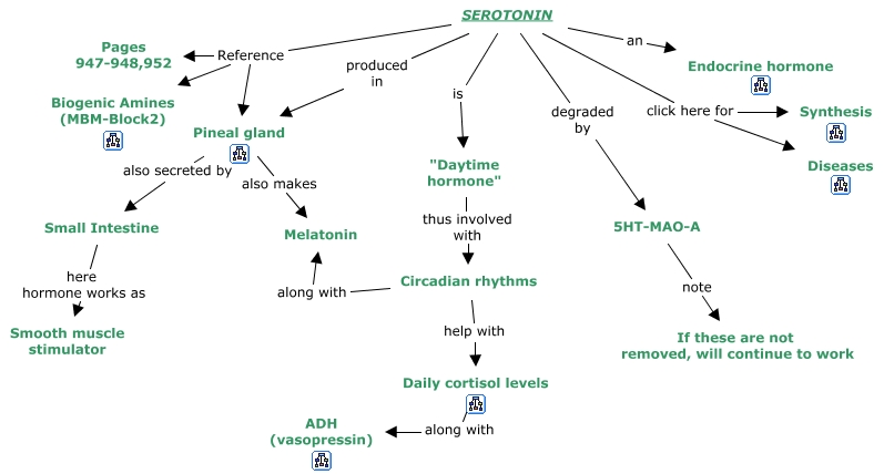 This Concept Map, created with IHMC CmapTools, has information related to: 10a. Serotonin, SEROTONIN Reference Pineal gland, SEROTONIN click here for Synthesis, "Daytime hormone" thus involved with Circadian rhythms, Circadian rhythms help with Daily cortisol levels, SEROTONIN Reference Biogenic Amines (MBM-Block2), SEROTONIN is "Daytime hormone", Daily cortisol levels along with ADH (vasopressin), SEROTONIN degraded by 5HT-MAO-A, SEROTONIN Reference Pages 947-948,952, Circadian rhythms along with Melatonin, SEROTONIN produced in Pineal gland, 5HT-MAO-A note If these are not removed, will continue to work, Pineal gland also makes Melatonin, Small Intestine here hormone works as Smooth muscle stimulator, Pineal gland also secreted by Small Intestine, SEROTONIN click here for Diseases, SEROTONIN an Endocrine hormone