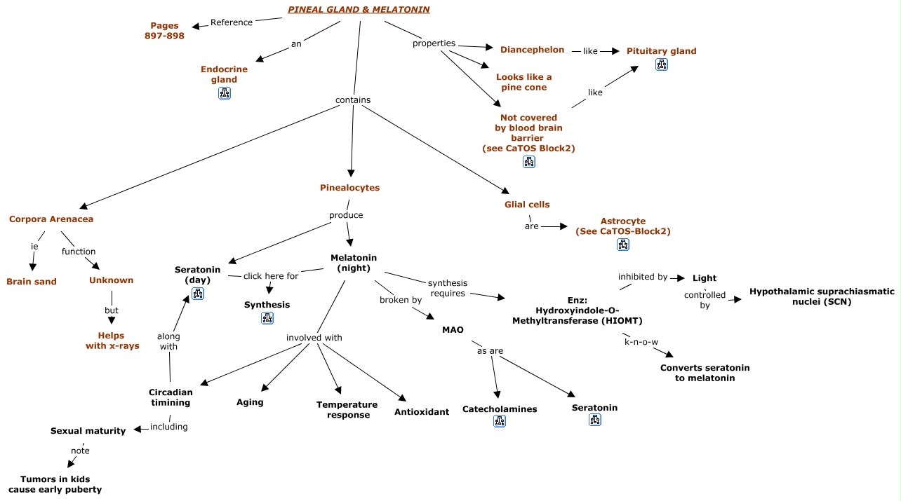 This Concept Map, created with IHMC CmapTools, has information related to: 10. Pineal Gland & Melatonin, Pinealocytes produce Melatonin (night), PINEAL GLAND & MELATONIN contains Pinealocytes, Melatonin (night) involved with Aging, Seratonin (day) click here for Synthesis, Melatonin (night) involved with Antioxidant, Melatonin (night) broken by MAO, MAO as are Catecholamines, Enz: Hydroxyindole-O- Methyltransferase (HIOMT) inhibited by Light, Pinealocytes produce Seratonin (day), Circadian timining including Sexual maturity, PINEAL GLAND & MELATONIN properties Diancephelon, PINEAL GLAND & MELATONIN properties Looks like a pine cone, PINEAL GLAND & MELATONIN an Endocrine gland, PINEAL GLAND & MELATONIN properties Not covered by blood brain barrier (see CaTOS Block2), Corpora Arenacea ie Brain sand, PINEAL GLAND & MELATONIN contains Glial cells, MAO as are Seratonin, Corpora Arenacea function Unknown, Melatonin (night) involved with Circadian timining, Melatonin (night) click here for Synthesis