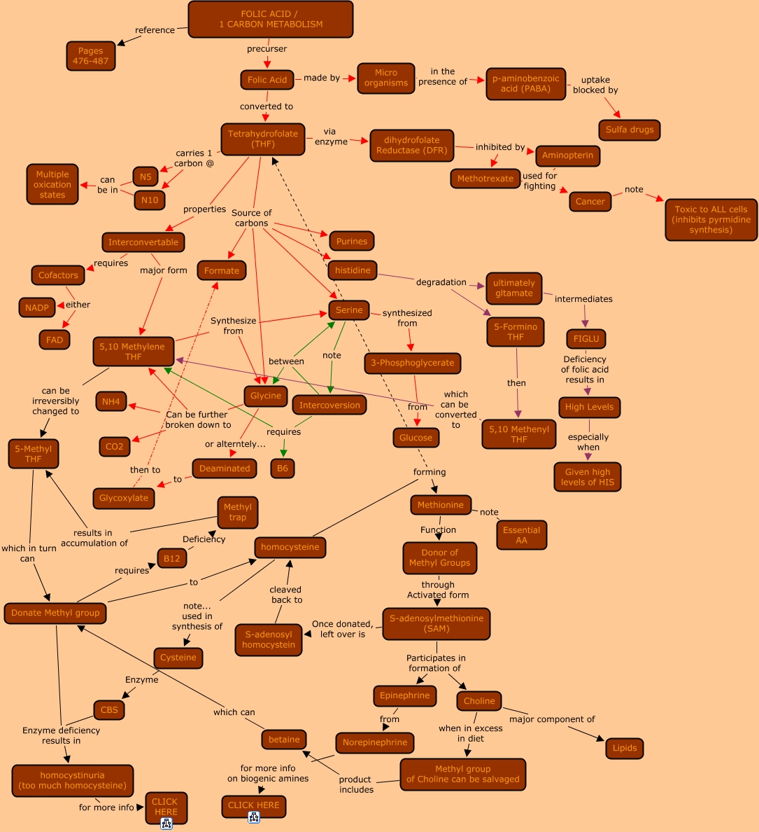 This Concept Map, created with IHMC CmapTools, has information related to: 05. One carbon metabolism, Glycine or alterntely... Deaminated, S-adenosylmethionine (SAM) Once donated, left over is S-adenosyl homocystein, Folic Acid made by Micro organisms, 5,10 Methylene THF Synthesize from Glycine, N5 can be in Multiple oxication states, Intercoversion requires B6, histidine degradation ultimately gltamate, High Levels especially when Given high levels of HIS, B12 Deficiency Methyl trap, Micro organisms in the presence of p-aminobenzoic acid (PABA), Tetrahydrofolate (THF) properties Interconvertable, homocysteine note... used in synthesis of Cysteine, CBS Enzyme deficiency results in homocystinuria (too much homocysteine), Cancer note Toxic to ALL cells (inhibits pyrmidine synthesis), Cofactors either NADP, Tetrahydrofolate (THF) Source of carbons Serine, dihydrofolate Reductase (DFR) inhibited by Methotrexate, 5,10 Methenyl THF which can be converted to 5,10 Methylene THF, Tetrahydrofolate (THF) Source of carbons Glycine, Tetrahydrofolate (THF) Source of carbons Formate