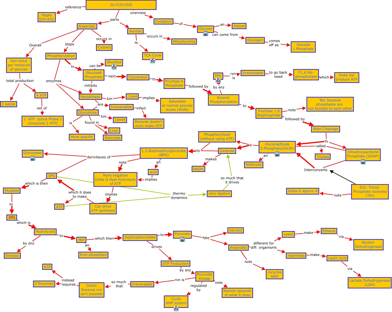 This Concept Map, created with IHMC CmapTools, has information related to: 14. Glycolysis Overview - Anaerobic, Hexokinase are Irreversalbe, Conversion to Fructose 6 Phosphate, Enz: Triose Phosphate Isoerase (TPI) note Delta G approx 0, Pyruvate fate Aerobic, Glucose can come from Glycogen, 3PG derivitaves of Glycerates, Glyceraldhyde 3 Phosphate(GA3P) is Phosphorylized (without using ATP), Hydrolyzed to PEP, Oxidized makes NADH, F1,6 bis- phosphetase which Does not produce ATP, GLYCOLYSIS overview Oxidation, Ethanol via Alcohol Dehydrogenase, Glucokinse found in Liver, Irreversable to go back need F1,6 bis- phosphetase, Fructose 6 Phosphate followed by Second Phosphorylation, Can drive ATP synthesis which it does to make ATP, 2PG which is Hydrolyzed, Glucose an Aldose, Anaerobic note recycles NAD, 3PG which is then Mutated
