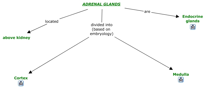 This Concept Map, created with IHMC CmapTools, has information related to: 06. Adrenal Glands, ADRENAL GLANDS are Endocrine glands, ADRENAL GLANDS divided into (based on embryology) Cortex, ADRENAL GLANDS located above kidney, ADRENAL GLANDS divided into (based on embryology) Medulla