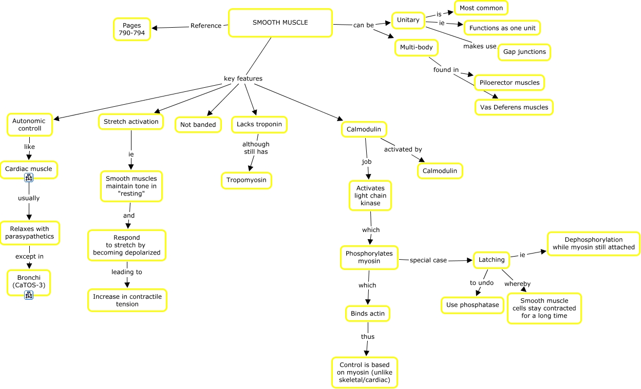 This Concept Map, created with IHMC CmapTools, has information related to: 37. Smooth Muscle, Multi-body found in Vas Deferens muscles, SMOOTH MUSCLE key features Not banded, Autonomic controll like Cardiac muscle, Relaxes with parasypathetics except in Bronchi (CaTOS-3), Latching whereby Smooth muscle cells stay contracted for a long time, Lacks troponin although still has Tropomyosin, Unitary ie Functions as one unit, Calmodulin activated by Calmodulin, Activates light chain kinase which Phosphorylates myosin, SMOOTH MUSCLE Reference Pages 790-794, Smooth muscles maintain tone in "resting" and Respond to stretch by becoming depolarized, Binds actin thus Control is based on myosin (unlike skeletal/cardiac), SMOOTH MUSCLE key features Stretch activation, Unitary is Most common, Stretch activation ie Smooth muscles maintain tone in "resting", SMOOTH MUSCLE key features Autonomic controll, Phosphorylates myosin special case Latching, Cardiac muscle usually Relaxes with parasypathetics, SMOOTH MUSCLE can be Unitary, SMOOTH MUSCLE key features Lacks troponin