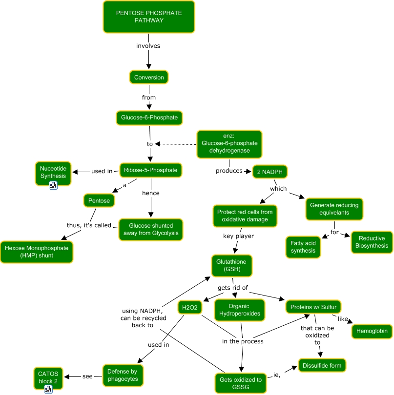 This Concept Map, created with IHMC CmapTools, has information related to: 19. Pentose Phosphate Pathway, Glutathione (GSH) gets rid of Organic Hydroperoxides, H2O2 in the process Gets oxidized to GSSG, Defense by phagocytes see CATOS block 2, Organic Hydroperoxides in the process Proteins w/ Sulfur, 2 NADPH which Protect red cells from oxidative damage, Generate reducing equivelants for Reductive Biosynthesis, H2O2 used in Defense by phagocytes, Ribose-5-Phosphate a Pentose, Glutathione (GSH) gets rid of Proteins w/ Sulfur, H2O2 in the process Proteins w/ Sulfur, enz: Glucose-6-phosphate dehydrogenase to Ribose-5-Phosphate, Generate reducing equivelants for Fatty acid synthesis, Organic Hydroperoxides in the process Gets oxidized to GSSG, Ribose-5-Phosphate used in Nuceotide Synthesis, PENTOSE PHOSPHATE PATHWAY involves Conversion, Glucose shunted away from Glycolysis thus, it's called Hexose Monophosphate (HMP) shunt, Gets oxidized to GSSG ie, Dissulfide form, 2 NADPH which Generate reducing equivelants, enz: Glucose-6-phosphate dehydrogenase produces 2 NADPH, Glutathione (GSH) gets rid of H2O2