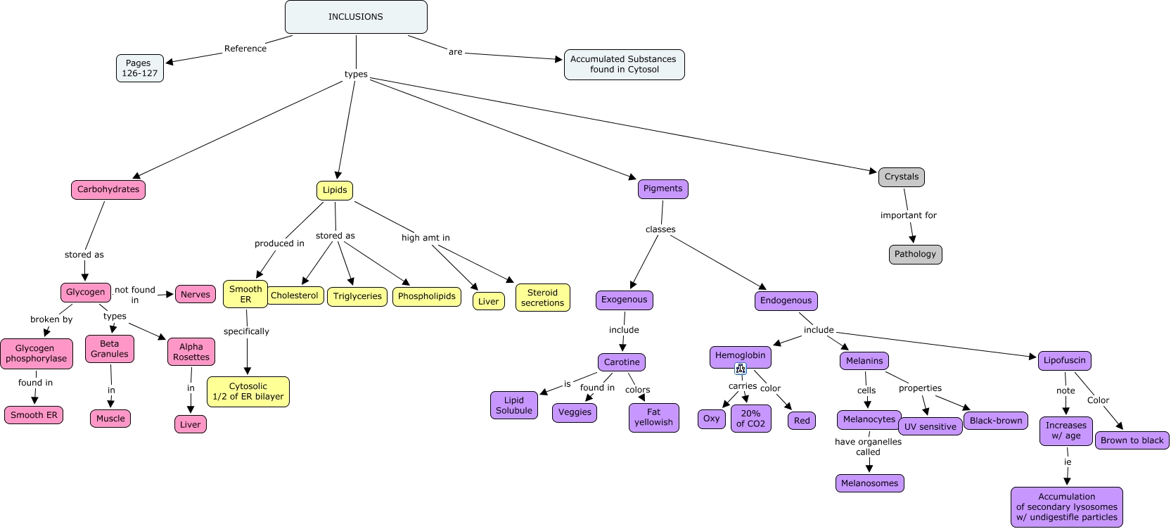 This Concept Map, created with IHMC CmapTools, has information related to: 08. Inclusions, Carotine found in Veggies, Lipids high amt in Steroid secretions, Smooth ER specifically Cytosolic 1/2 of ER bilayer, Increases w/ age ie Accumulation of secondary lysosomes w/ undigestifle particles, Carotine colors Fat yellowish, Melanins properties UV sensitive, Lipofuscin note Increases w/ age, INCLUSIONS types Carbohydrates, Pigments classes Endogenous, Pigments classes Exogenous, Glycogen types Beta Granules, Carbohydrates stored as Glycogen, INCLUSIONS types Lipids, Alpha Rosettes in Liver, Crystals important for Pathology, Lipofuscin Color Brown to black, INCLUSIONS Reference Pages 126-127, INCLUSIONS types Pigments, Glycogen types Alpha Rosettes, Endogenous include Hemoglobin