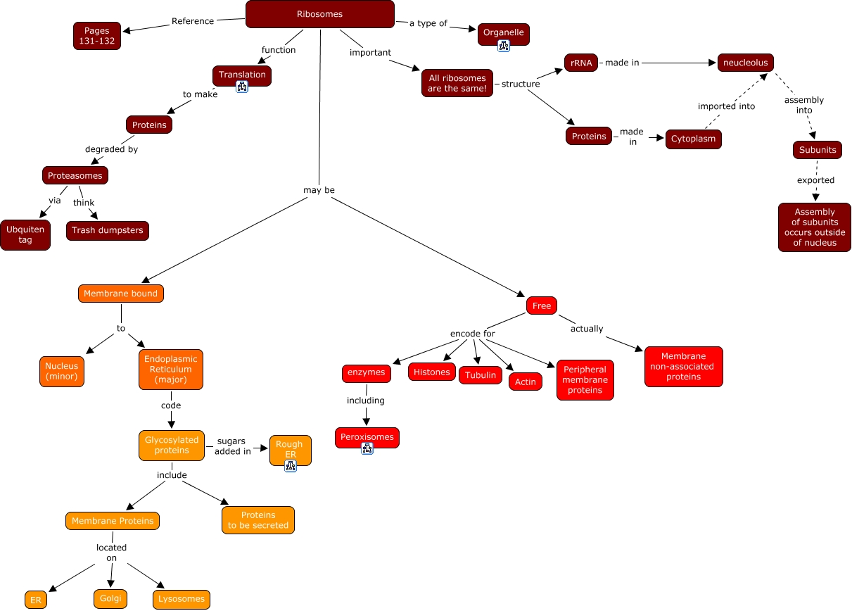 This Concept Map, created with IHMC CmapTools, has information related to: 09. Ribosomes & Glycoproteins, Glycosylated proteins include Membrane Proteins, Free actually Membrane non-associated proteins, Proteasomes via Ubquiten tag, Membrane Proteins located on Lysosomes, Free encode for Peripheral membrane proteins, Ribosomes may be Free, Ribosomes function Translation, neucleolus assembly into Subunits, Glycosylated proteins sugars added in Rough ER, Membrane Proteins located on ER, Endoplasmic Reticulum (major) code Glycosylated proteins, Ribosomes a type of Organelle, Subunits exported Assembly of subunits occurs outside of nucleus, Free encode for Histones, Translation to make Proteins, Glycosylated proteins include Proteins to be secreted, Free encode for enzymes, Proteins degraded by Proteasomes, Membrane bound to Endoplasmic Reticulum (major), Membrane bound to Nucleus (minor)
