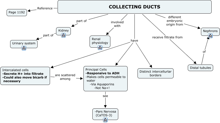 This Concept Map, created with IHMC CmapTools, has information related to: 29a5. Collecting Ducts, COLLECTING DUCTS Reference Page 1192, COLLECTING DUCTS different embryonic origin from Nephrons, COLLECTING DUCTS have Principal Cells -Responsive to ADH -Makes cells permeable to water -Via Aquaporins -Not Na+!, Principal Cells -Responsive to ADH -Makes cells permeable to water -Via Aquaporins -Not Na+! see -Pars Nervosa (CaTOS-3), COLLECTING DUCTS part of Kidney, COLLECTING DUCTS receive filtrate from Distal tubules, COLLECTING DUCTS have Distinct intercellurlar borders, COLLECTING DUCTS have Intercalated cells -Secrete H+ into filtrate -Could also move bicarb if necessary, Distal tubules of Nephrons, Intercalated cells -Secrete H+ into filtrate -Could also move bicarb if necessary are scattered among Principal Cells -Responsive to ADH -Makes cells permeable to water -Via Aquaporins -Not Na+!, Kidney part of Urinary system, COLLECTING DUCTS involved with Renal physiology