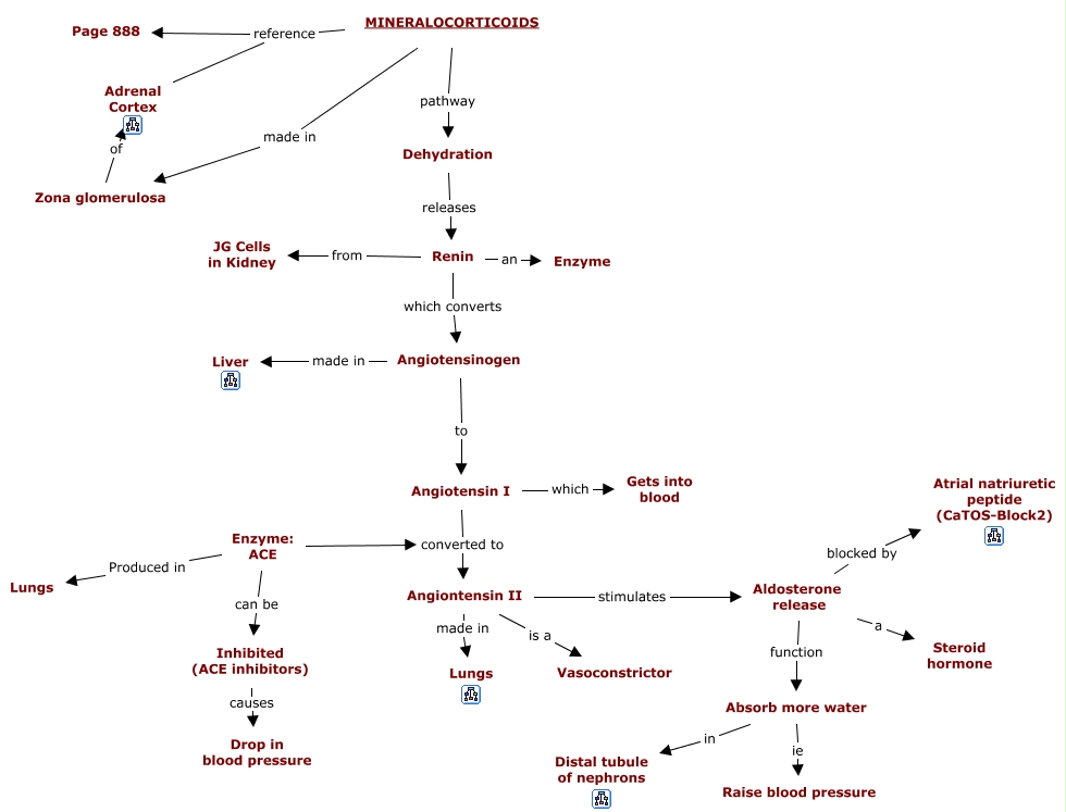 This Concept Map, created with IHMC CmapTools, has information related to: 07. Mineralocorticoids, Enzyme: ACE Produced in Lungs, Angiotensin I converted to Angiontensin II, Angiontensin II stimulates Aldosterone release, Renin an Enzyme, MINERALOCORTICOIDS reference Page 888, Absorb more water in Distal tubule of nephrons, Enzyme: ACE converted to Angiontensin II, MINERALOCORTICOIDS reference Adrenal Cortex, Renin which converts Angiotensinogen, Inhibited (ACE inhibitors) causes Drop in blood pressure, Angiontensin II made in Lungs, Renin from JG Cells in Kidney, Aldosterone release blocked by Atrial natriuretic peptide (CaTOS-Block2), Angiontensin II is a Vasoconstrictor, Dehydration releases Renin, MINERALOCORTICOIDS made in Zona glomerulosa, Enzyme: ACE can be Inhibited (ACE inhibitors), Angiotensin I which Gets into blood, Absorb more water ie Raise blood pressure, Angiotensinogen to Angiotensin I