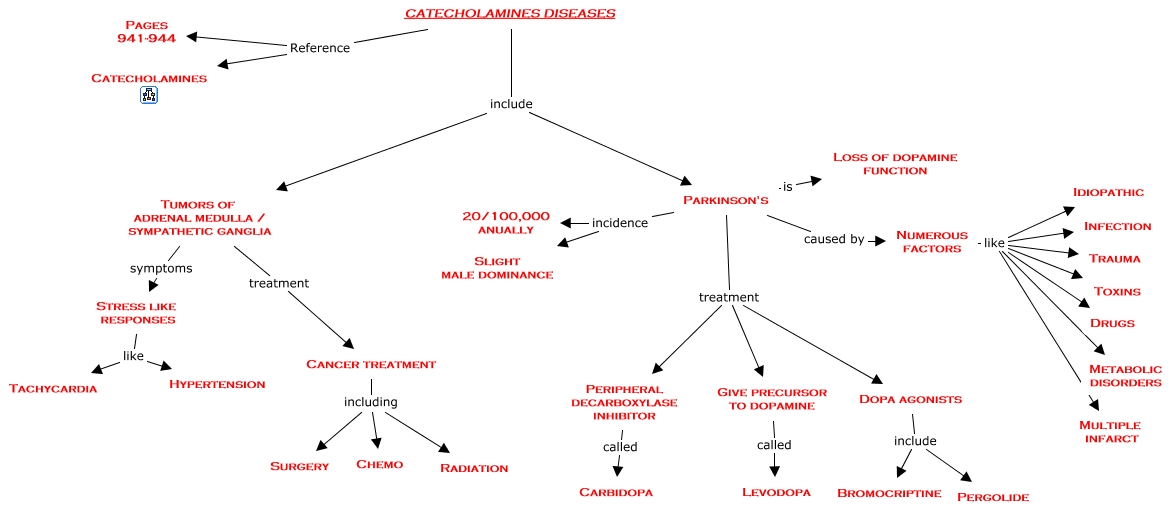 This Concept Map, created with IHMC CmapTools, has information related to: 13b. Catecholamine Diseases, Dopa agonists include Pergolide, Parkinson's caused by Numerous factors, Stress like responses like Tachycardia, CATECHOLAMINES DISEASES include Parkinson's, Numerous factors like Toxins, Numerous factors like Idiopathic, Parkinson's treatment Peripheral decarboxylase inhibitor, Tumors of adrenal medulla / sympathetic ganglia symptoms Stress like responses, CATECHOLAMINES DISEASES Reference Catecholamines, Cancer treatment including Chemo, Parkinson's is Loss of dopamine function, CATECHOLAMINES DISEASES include Tumors of adrenal medulla / sympathetic ganglia, Tumors of adrenal medulla / sympathetic ganglia treatment Cancer treatment, Cancer treatment including Radiation, Numerous factors like Metabolic disorders, Numerous factors like Drugs, Parkinson's incidence 20/100,000 anually, Cancer treatment including Surgery, Parkinson's treatment Give precursor to dopamine, CATECHOLAMINES DISEASES Reference Pages 941-944