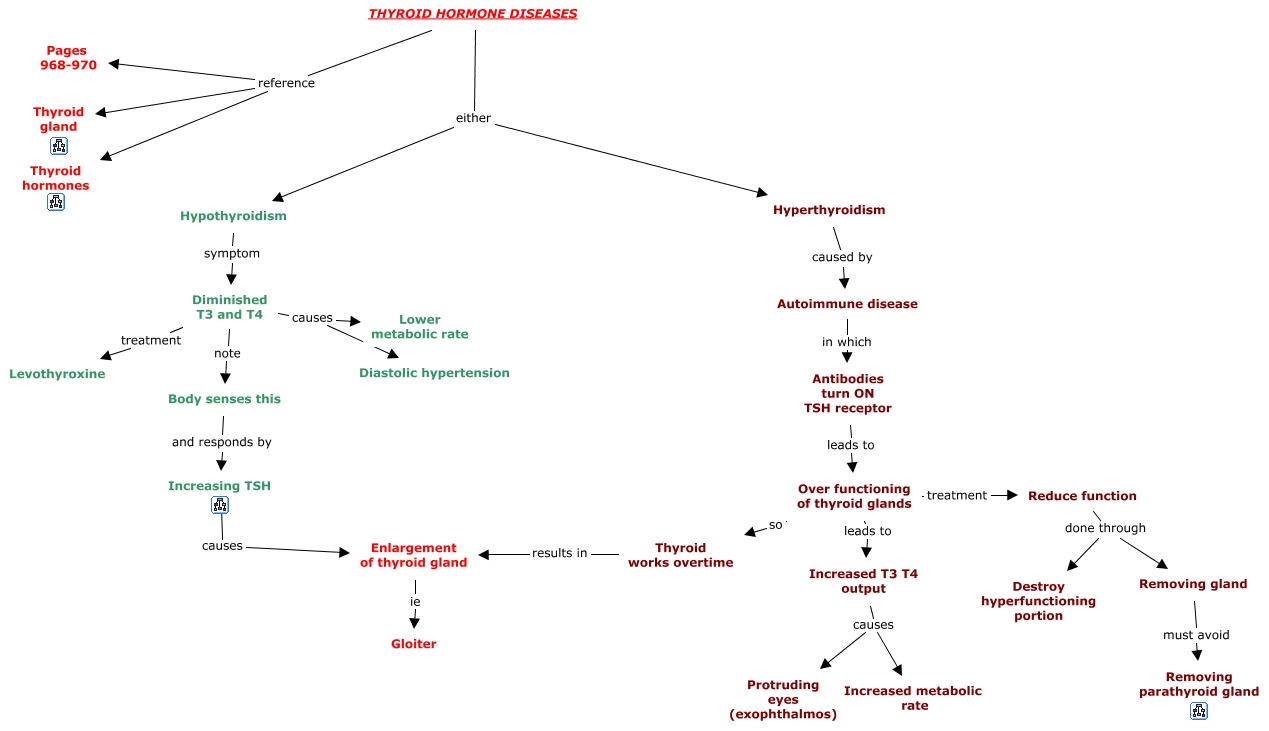 This Concept Map, created with IHMC CmapTools, has information related to: 04b. Thyroid Hormone Diseases, THYROID HORMONE DISEASES reference Thyroid hormones, THYROID HORMONE DISEASES either Hyperthyroidism, Autoimmune disease in which Antibodies turn ON TSH receptor, Over functioning of thyroid glands so Thyroid works overtime, Hypothyroidism symptom Diminished T3 and T4, Diminished T3 and T4 causes Lower metabolic rate, Reduce function done through Destroy hyperfunctioning portion, Increasing TSH causes Enlargement of thyroid gland, Diminished T3 and T4 causes Diastolic hypertension, Hyperthyroidism caused by Autoimmune disease, Reduce function done through Removing gland, Removing gland must avoid Removing parathyroid gland, Increased T3 T4 output causes Increased metabolic rate, THYROID HORMONE DISEASES reference Thyroid gland, Over functioning of thyroid glands treatment Reduce function, THYROID HORMONE DISEASES either Hypothyroidism, Antibodies turn ON TSH receptor leads to Over functioning of thyroid glands, Increased T3 T4 output causes Protruding eyes (exophthalmos), THYROID HORMONE DISEASES reference Pages 968-970, Diminished T3 and T4 treatment Levothyroxine