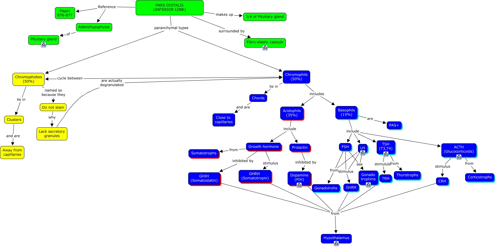 This Concept Map, created with IHMC CmapTools, has information related to: 02a. Pars Distalis, Basophils (15%) are PAS+, Basophils (15%) include TSH (T3,T4), Chromophils (50%) lie in Chords, FSH see Gonado trophins, PARS DISTALIS (ANTERIOR LOBE) Reference Pages 876-877, Prolactin inhibited by Dopamine (PIH), CRH from Hypothalamus, GHIH (Somatostatin) from Hypothalamus, Growth hormone stimulus GHRH (Somatotropin), Growth hormone from Somatotrophs, Acidophils (35%) include Prolactin, PARS DISTALIS (ANTERIOR LOBE) makes up 3/4 of Pituitary gland, Chromophobes (50%) named so because they Do not stain, Basophils (15%) include ACTH (Glucocorticoids), TRH from Hypothalamus, Acidophils (35%) include Growth hormone, LH stimulus GnRH, PARS DISTALIS (ANTERIOR LOBE) paranchymal types Chromophils (50%), Chromophobes (50%) lie in Clusters, Clusters and are Away from capillaries