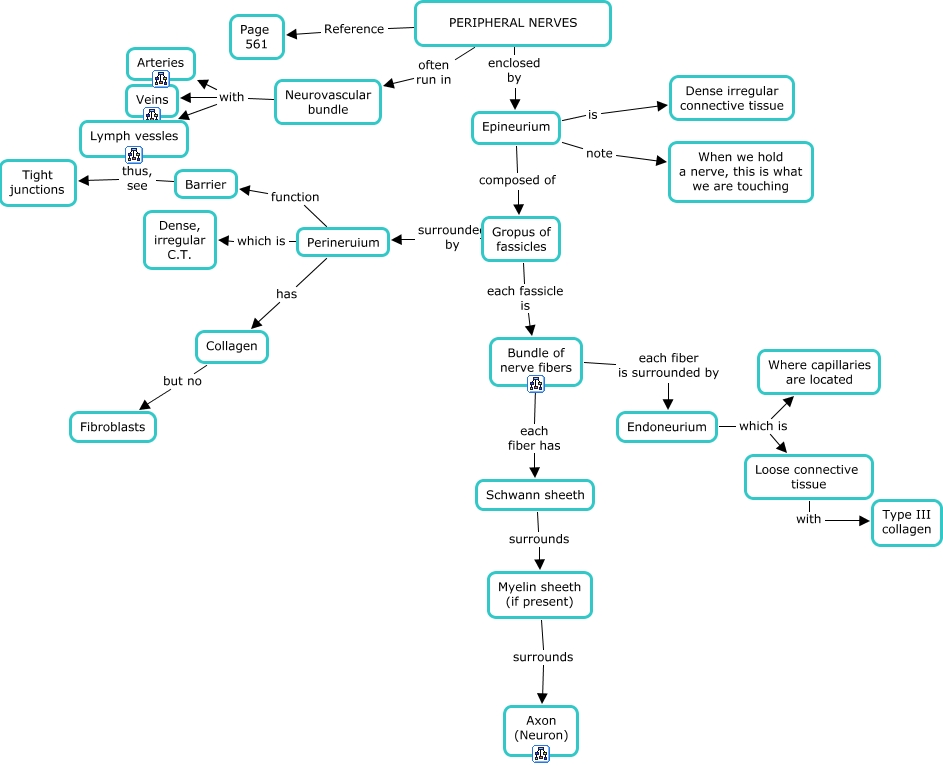 This Concept Map, created with IHMC CmapTools, has information related to: 19. Peripheral Nerves, Perineruium function Barrier, PERIPHERAL NERVES often run in Neurovascular bundle, PERIPHERAL NERVES Reference Page 561, Schwann sheeth surrounds Myelin sheeth (if present), Bundle of nerve fibers each fiber has Schwann sheeth, Neurovascular bundle with Veins, Epineurium is Dense irregular connective tissue, Epineurium note When we hold a nerve, this is what we are touching, Endoneurium which is Loose connective tissue, Neurovascular bundle with Lymph vessles, PERIPHERAL NERVES enclosed by Epineurium, Neurovascular bundle with Arteries, Bundle of nerve fibers each fiber is surrounded by Endoneurium, Perineruium which is Dense, irregular C.T., Endoneurium which is Where capillaries are located, Gropus of fassicles surrounded by Perineruium, Loose connective tissue with Type III collagen, Myelin sheeth (if present) surrounds Axon (Neuron), Barrier thus, see Tight junctions, Collagen but no Fibroblasts