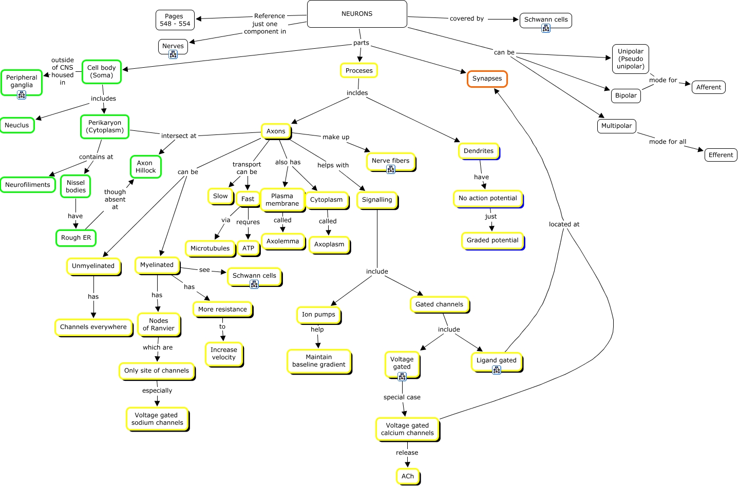 This Concept Map, created with IHMC CmapTools, has information related to: 16. Neurons-overview, NEURONS Reference Pages 548 - 554, Axons transport can be Fast, Ion pumps help Maintain baseline gradient, Signalling include Gated channels, Axons intersect at Axon Hillock, Myelinated has More resistance, Myelinated see Schwann cells, Bipolar mode for Afferent, Cell body (Soma) includes Perikaryon (Cytoplasm), Axons make up Nerve fibers, Axons can be Myelinated, Axons also has Plasma membrane, Fast via Microtubules, No action potential just Graded potential, Proceses incldes Dendrites, Gated channels include Voltage gated, Cell body (Soma) includes Neuclus, Perikaryon (Cytoplasm) contains at Neurofiliments, NEURONS covered by Schwann cells, Voltage gated calcium channels release ACh