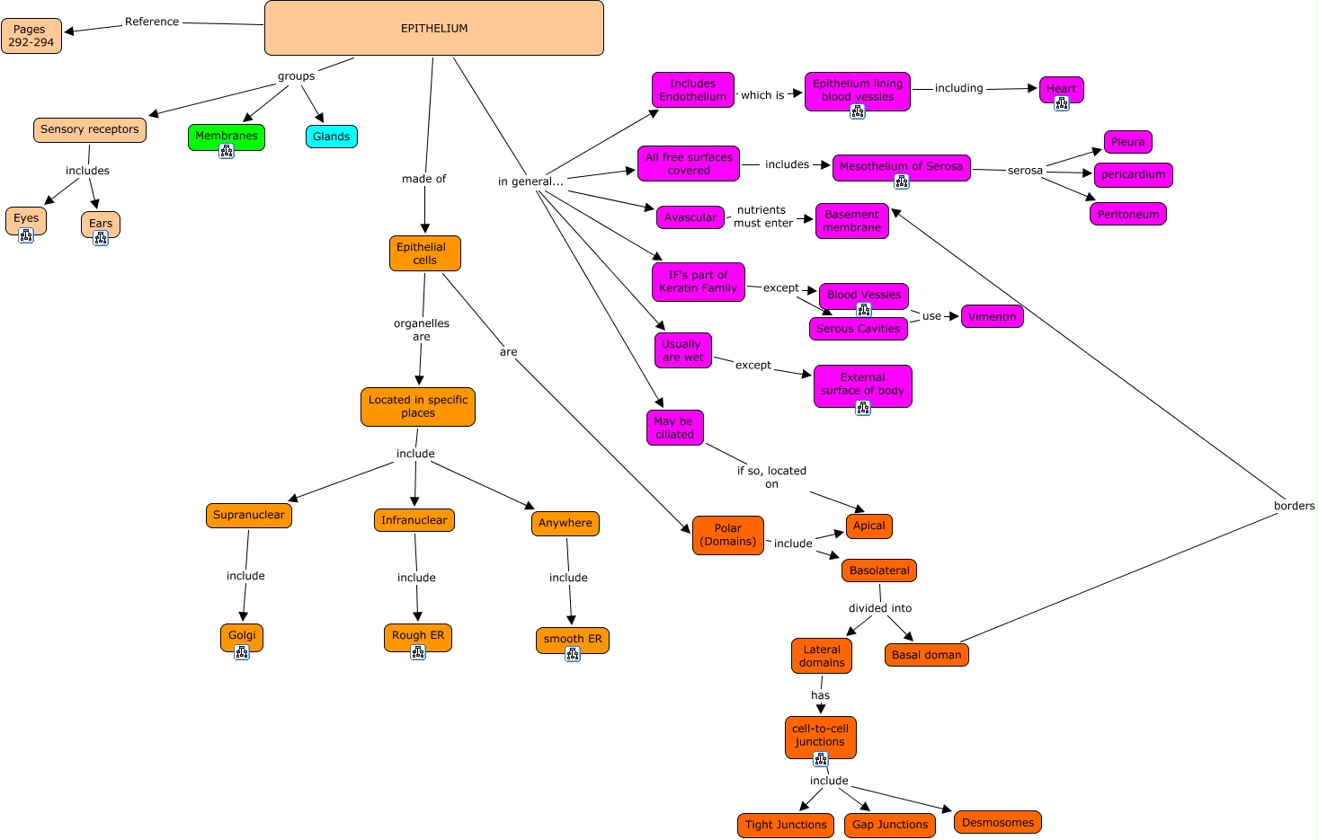 This Concept Map, created with IHMC CmapTools, has information related to: 03. Epithelium, cell-to-cell junctions include Gap Junctions, EPITHELIUM in general... May be ciliated, Basal doman borders Basement membrane, cell-to-cell junctions include Tight Junctions, EPITHELIUM groups Glands, EPITHELIUM groups Sensory receptors, Located in specific places include Anywhere, EPITHELIUM in general... IF's part of Keratin Family, Basolateral divided into Lateral domains, Epithelial cells organelles are Located in specific places, Located in specific places include Infranuclear, Epithelial cells are Polar (Domains), EPITHELIUM in general... Includes Endothelium, Basolateral divided into Basal doman, Polar (Domains) include Basolateral, EPITHELIUM in general... All free surfaces covered, cell-to-cell junctions include Desmosomes, Located in specific places include Supranuclear, Polar (Domains) include Apical, Mesothelium of Serosa serosa Pleura