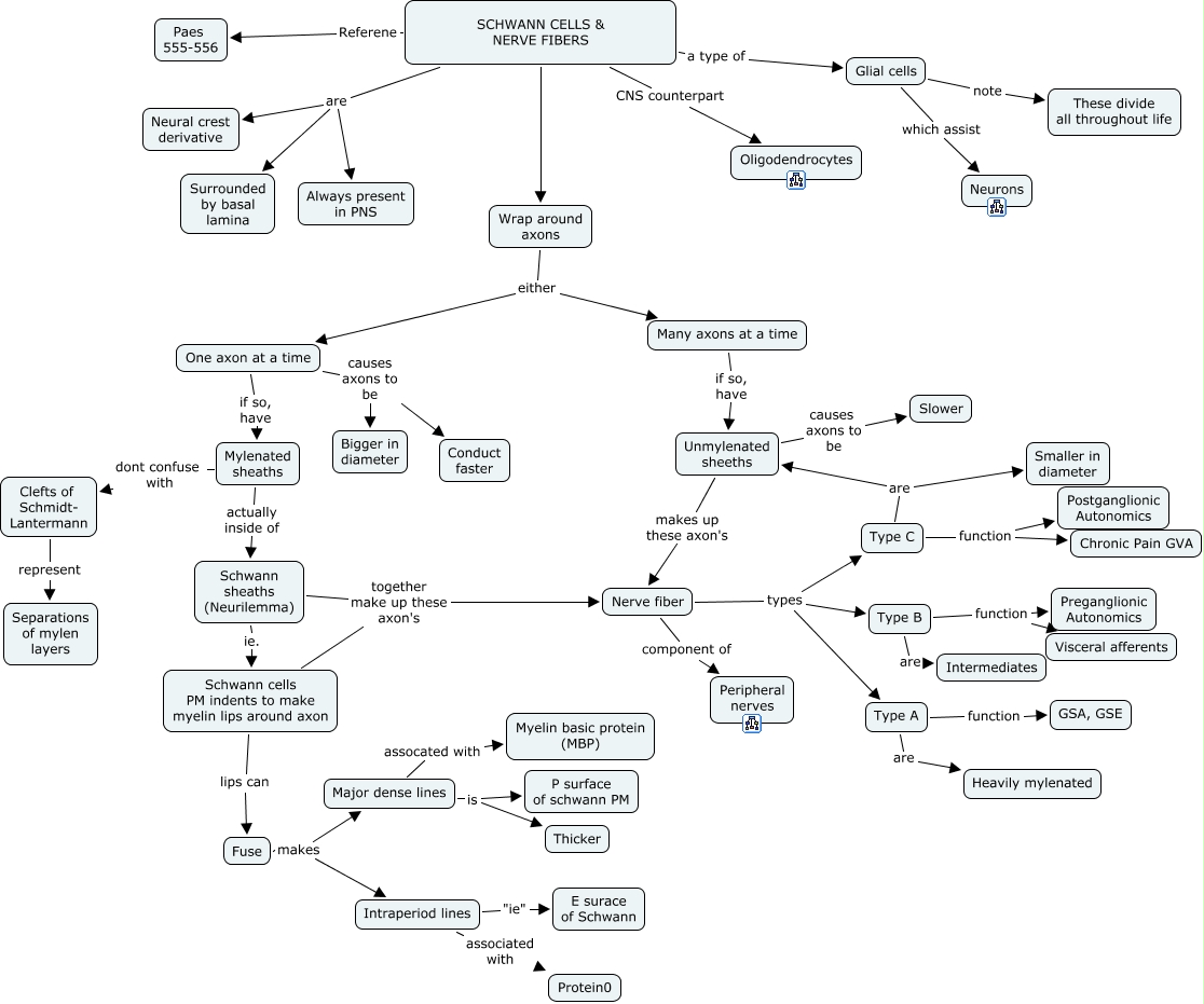 This Concept Map, created with IHMC CmapTools, has information related to: 17. Schwann Cells & Nerve Fiibers, SCHWANN CELLS & NERVE FIBERS CNS counterpart Oligodendrocytes, Schwann cells PM indents to make myelin lips around axon lips can Fuse, Glial cells which assist Neurons, Nerve fiber types Type C, Schwann sheaths (Neurilemma) together make up these axon's Nerve fiber, One axon at a time if so, have Mylenated sheaths, Type C are Smaller in diameter, Many axons at a time if so, have Unmylenated sheeths, SCHWANN CELLS & NERVE FIBERS are Always present in PNS, SCHWANN CELLS & NERVE FIBERS a type of Glial cells, Type B are Intermediates, SCHWANN CELLS & NERVE FIBERS Wrap around axons, Major dense lines assocated with Myelin basic protein (MBP), Schwann sheaths (Neurilemma) ie. Schwann cells PM indents to make myelin lips around axon, Mylenated sheaths actually inside of Schwann sheaths (Neurilemma), Fuse makes Intraperiod lines, Intraperiod lines associated with Protein0, Wrap around axons either Many axons at a time, Nerve fiber component of Peripheral nerves, Unmylenated sheeths causes axons to be Slower