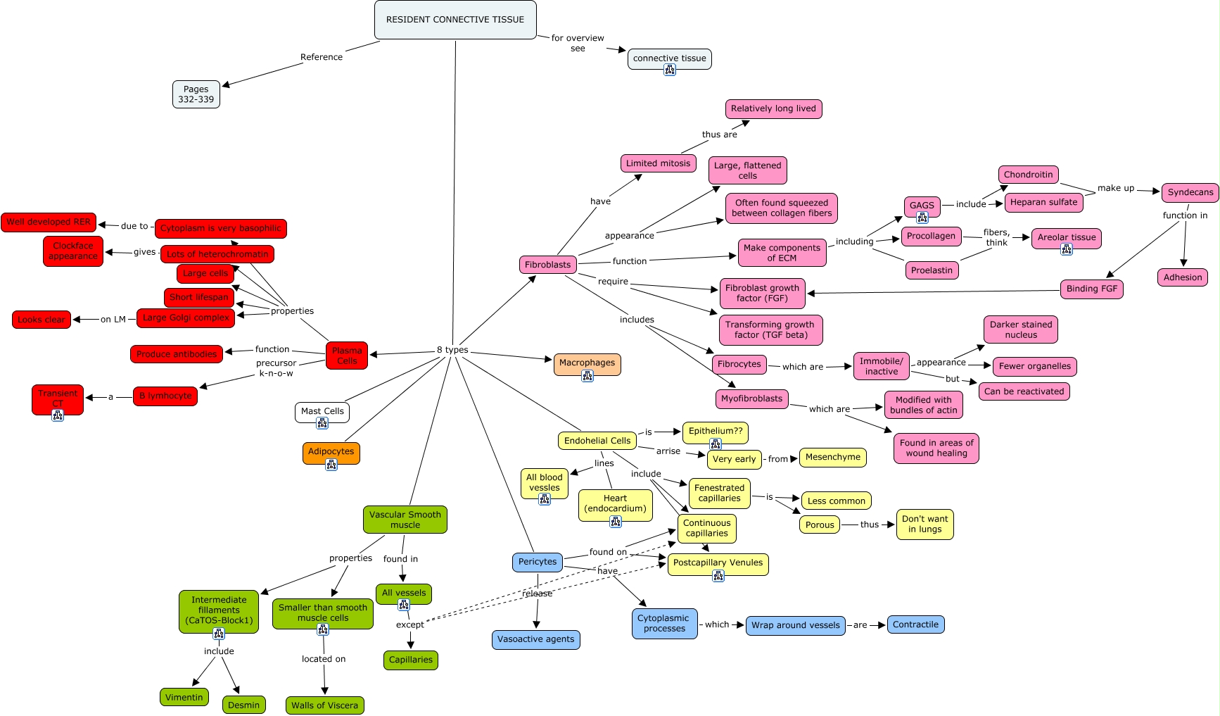 This Concept Map, created with IHMC CmapTools, has information related to: 08. Resident Connective tissue, RESIDENT CONNECTIVE TISSUE 8 types Fibroblasts, Immobile/ inactive appearance Fewer organelles, B lymhocyte a Transient CT, Vascular Smooth muscle properties Smaller than smooth muscle cells, All vessels except Postcapillary Venules, Binding FGF Fibroblast growth factor (FGF), Make components of ECM including GAGS, Endohelial Cells lines Heart (endocardium), Vascular Smooth muscle found in All vessels, Fenestrated capillaries is Porous, Pericytes release Vasoactive agents, Fenestrated capillaries is Less common, Fibroblasts appearance Often found squeezed between collagen fibers, RESIDENT CONNECTIVE TISSUE for overview see connective tissue, Lots of heterochromatin gives Clockface appearance, Very early from Mesenchyme, Immobile/ inactive but Can be reactivated, Pericytes found on Postcapillary Venules, Myofibroblasts which are Modified with bundles of actin, RESIDENT CONNECTIVE TISSUE 8 types Vascular Smooth muscle