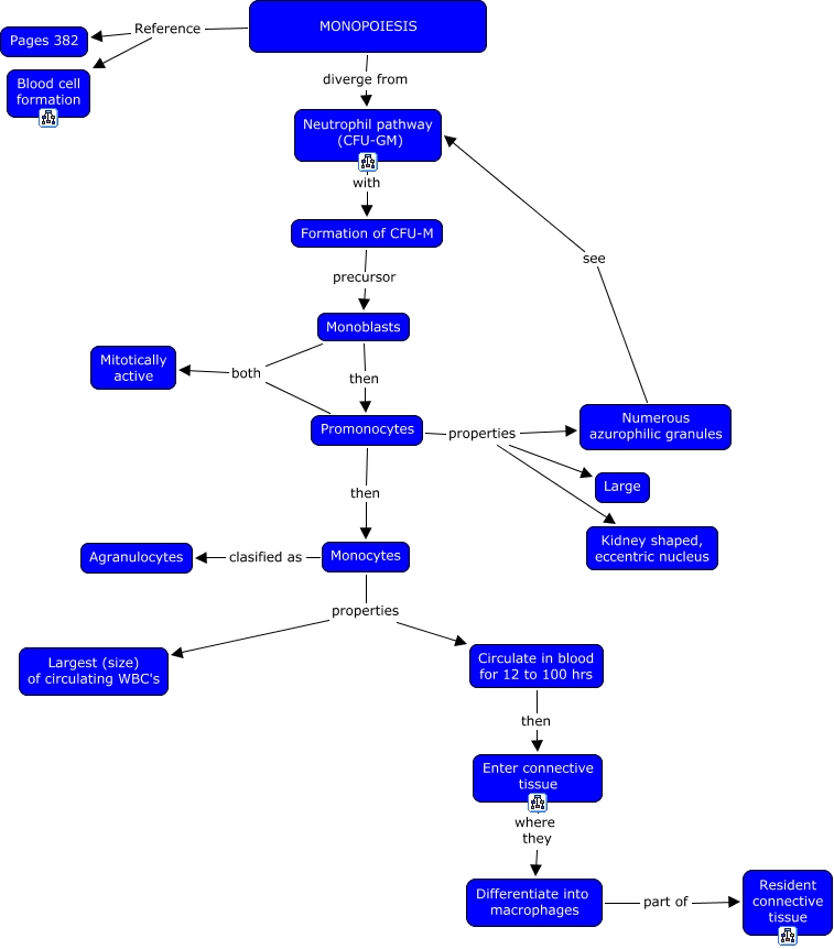 This Concept Map, created with IHMC CmapTools, has information related to: 13c. Monopoiesis, Monoblasts both Mitotically active, Monocytes properties Circulate in blood for 12 to 100 hrs, Monoblasts then Promonocytes, Promonocytes properties Kidney shaped, eccentric nucleus, Promonocytes properties Large, Circulate in blood for 12 to 100 hrs then Enter connective tissue, Promonocytes then Monocytes, Promonocytes properties Numerous azurophilic granules, Monocytes properties Largest (size) of circulating WBC's, Enter connective tissue where they Differentiate into macrophages, Numerous azurophilic granules see Neutrophil pathway (CFU-GM), Formation of CFU-M precursor Monoblasts, Monocytes clasified as Agranulocytes, Differentiate into macrophages part of Resident connective tissue, Neutrophil pathway (CFU-GM) with Formation of CFU-M, MONOPOIESIS Reference Blood cell formation, Promonocytes both Mitotically active, MONOPOIESIS diverge from Neutrophil pathway (CFU-GM), MONOPOIESIS Reference Pages 382