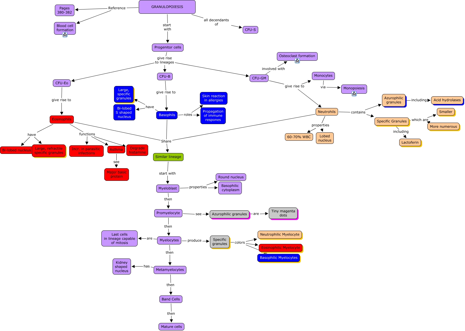 This Concept Map, created with IHMC CmapTools, has information related to: 13b. Granulopoiesis, Similar lineage start with Myeloblast, Asthma see Major basic protein, Eosinophils have Large, refractile specific granules, Specific Granules including Lactoferin, Myelocytes produce Specific granules, Myelocytes then Metamyelocytes, Basophils have Bi-lobed S shaped nucleus, GRANULOPOIESIS all decendants of CFU-S, GRANULOPOIESIS Reference Blood cell formation, Neutrohils contains Specific Granules, Azurophilic granules are Tiny magenta dots, CFU-GM involved with Osteoclast formation, Basophils roles Skin reaction in allergies, Metamyelocytes then Band Cells, CFU-GM give rise to Monocytes, Specific Granules which are More numerous, Promyelocyte see Azurophilic granules, Eosinophils Share Similar lineage, Myeloblast then Promyelocyte, Specific granules colors Neutrophilic Myelocyte
