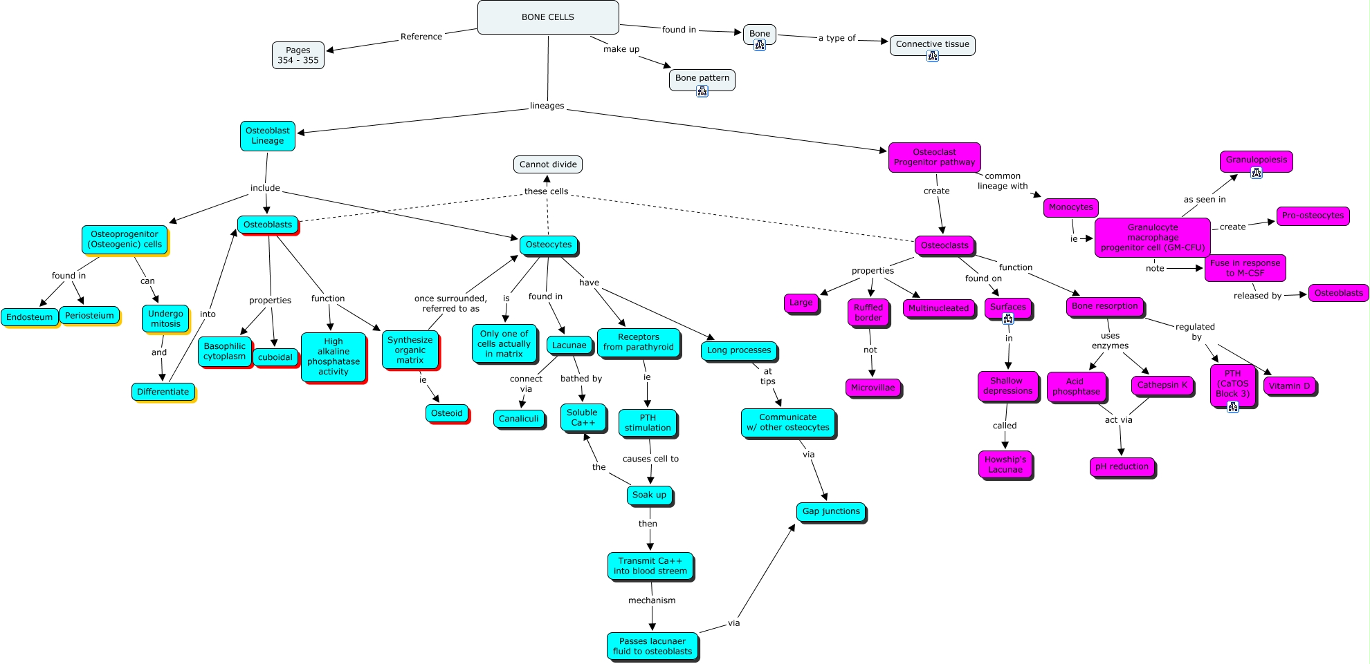 This Concept Map, created with IHMC CmapTools, has information related to: 11a. Bone Cells, Osteoclasts function Bone resorption, Passes lacunaer fluid to osteoblasts via Gap junctions, Osteoblasts these cells Cannot divide, Osteocytes these cells Cannot divide, Communicate w/ other osteocytes via Gap junctions, Osteoblasts function Synthesize organic matrix, Bone resorption regulated by PTH (CaTOS Block 3), Osteoclasts found on Surfaces, Lacunae connect via Canaliculi, Osteocytes have Long processes, Soak up then Transmit Ca++ into blood streem, Osteoblasts properties cuboidal, Lacunae bathed by Soluble Ca++, Osteoclasts these cells Cannot divide, Osteocytes is Only one of cells actually in matrix, Osteoclast Progenitor pathway create Osteoclasts, Osteoblast Lineage include Osteocytes, Osteoprogenitor (Osteogenic) cells found in Endosteum, Osteocytes have Receptors from parathyroid, BONE CELLS Reference Pages 354 - 355