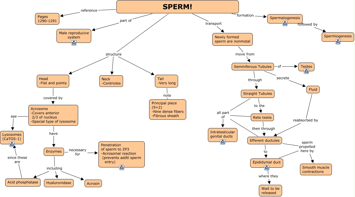 This Concept Map, created with IHMC CmapTools, has information related to: 31b. Sperm, Spermatogenesis followed by Spermiogenesis, Efferent ductules all part of Intratesticular genital ducts, SPERM! transport Newly formed sperm are nonmotal, Acid phosphatase since these are Lysosomes (CaTOS-1), Enzymes including Acrosin, Acrosome -Covers anterior 2/3 of nucleus -Special type of lysosome have Enzymes, Epididymal duct sperm propelled here by Smooth muscle contractions, Rete testis then through Efferent ductules, SPERM! reference Pages 1290-1291, Acrosome -Covers anterior 2/3 of nucleus -Special type of lysosome see Lysosomes (CaTOS-1), SPERM! formation Spermatogenesis, Straight Tubules all part of Intratesticular genital ducts, Efferent ductules to Epididymal duct, Enzymes including Acid phosphatase, Newly formed sperm are nonmotal move from Seminiferous Tubules, Efferent ductules sperm propelled here by Smooth muscle contractions, SPERM! structure Head -Flat and pointy, SPERM! part of Male reproducive system, Seminiferous Tubules through Straight Tubules, SPERM! structure Tail -Very long