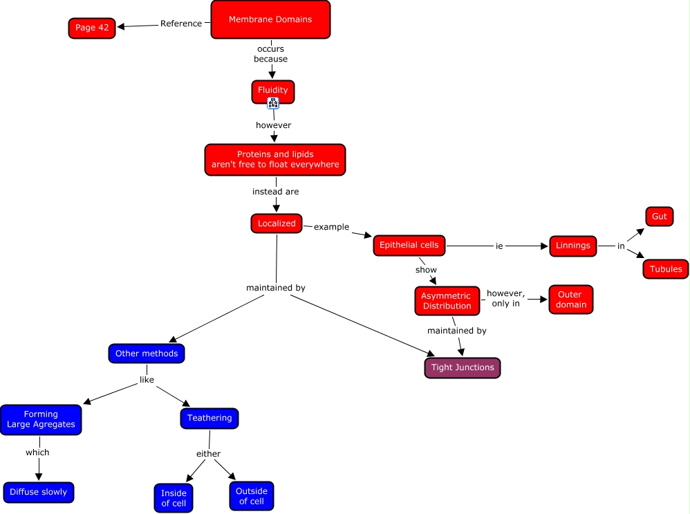 This Concept Map, created with IHMC CmapTools, has information related to: 04. Domains, Teathering either Inside of cell, Fluidity however Proteins and lipids aren't free to float everywhere, Membrane Domains occurs because Fluidity, Forming Large Agregates which Diffuse slowly, Epithelial cells ie Linnings, Linnings in Tubules, Asymmetric Distribution however, only in Outer domain, Proteins and lipids aren't free to float everywhere instead are Localized, Other methods like Forming Large Agregates, Teathering either Outside of cell, Linnings in Gut, Other methods like Teathering, Membrane Domains Reference Page 42, Localized maintained by Tight Junctions, Localized example Epithelial cells, Localized maintained by Other methods, Asymmetric Distribution maintained by Tight Junctions, Epithelial cells show Asymmetric Distribution