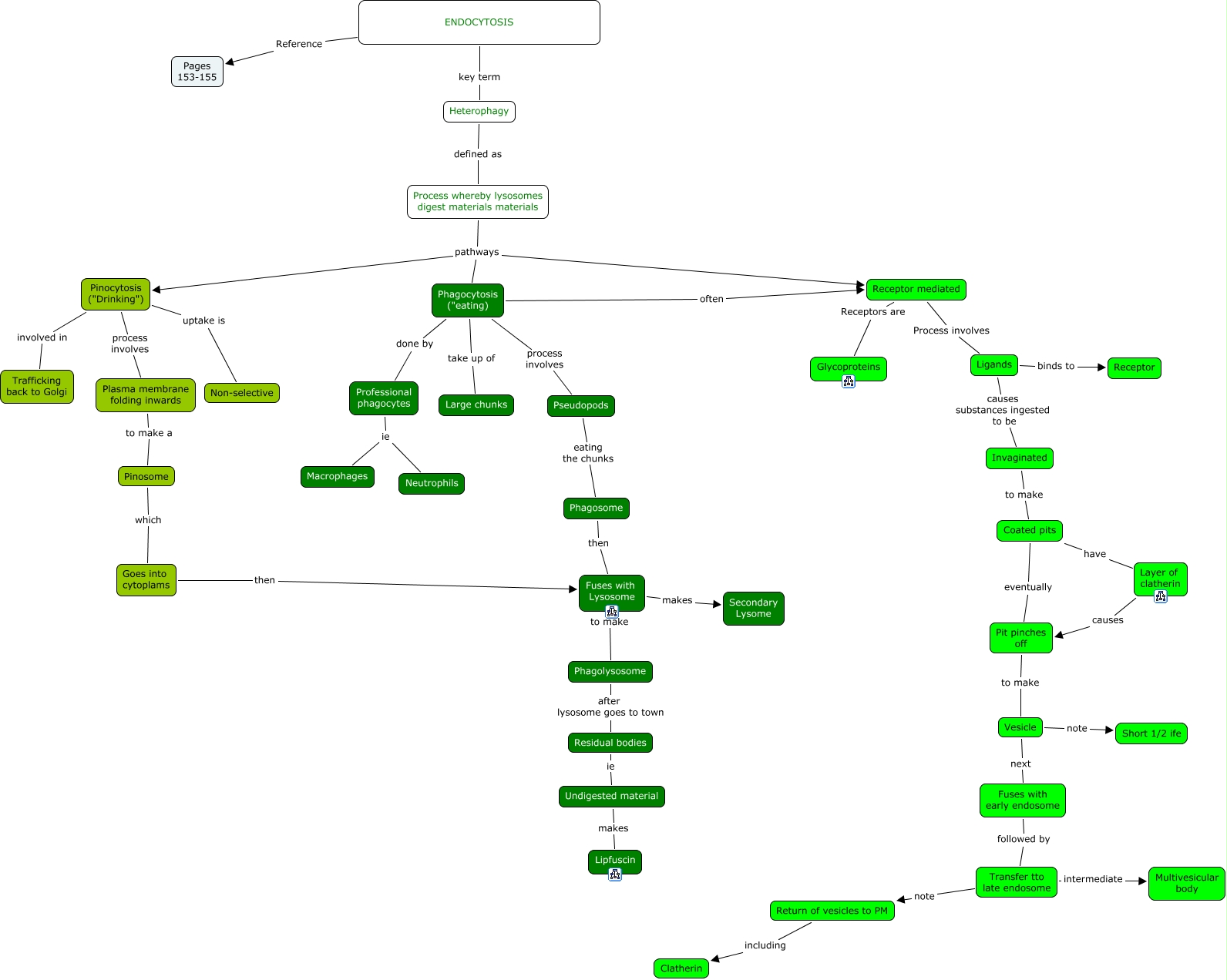 This Concept Map, created with IHMC CmapTools, has information related to: 18. Endocytosis, Phagocytosis ("eating) often Receptor mediated, Pinocytosis ("Drinking") involved in Trafficking back to Golgi, Process whereby lysosomes digest materials materials pathways Receptor mediated, Layer of clatherin causes Pit pinches off, Return of vesicles to PM including Clatherin, Phagocytosis ("eating) done by Professional phagocytes, Plasma membrane folding inwards to make a Pinosome, Phagocytosis ("eating) take up of Large chunks, Undigested material makes Lipfuscin, Receptor mediated Receptors are Glycoproteins, Pseudopods eating the chunks Phagosome, Transfer tto late endosome intermediate Multivesicular body, Coated pits have Layer of clatherin, Pinocytosis ("Drinking") process involves Plasma membrane folding inwards, Goes into cytoplams then Fuses with Lysosome, Heterophagy defined as Process whereby lysosomes digest materials materials, Process whereby lysosomes digest materials materials pathways Pinocytosis ("Drinking"), ENDOCYTOSIS Reference Pages 153-155, Phagolysosome after lysosome goes to town Residual bodies, Fuses with early endosome followed by Transfer tto late endosome