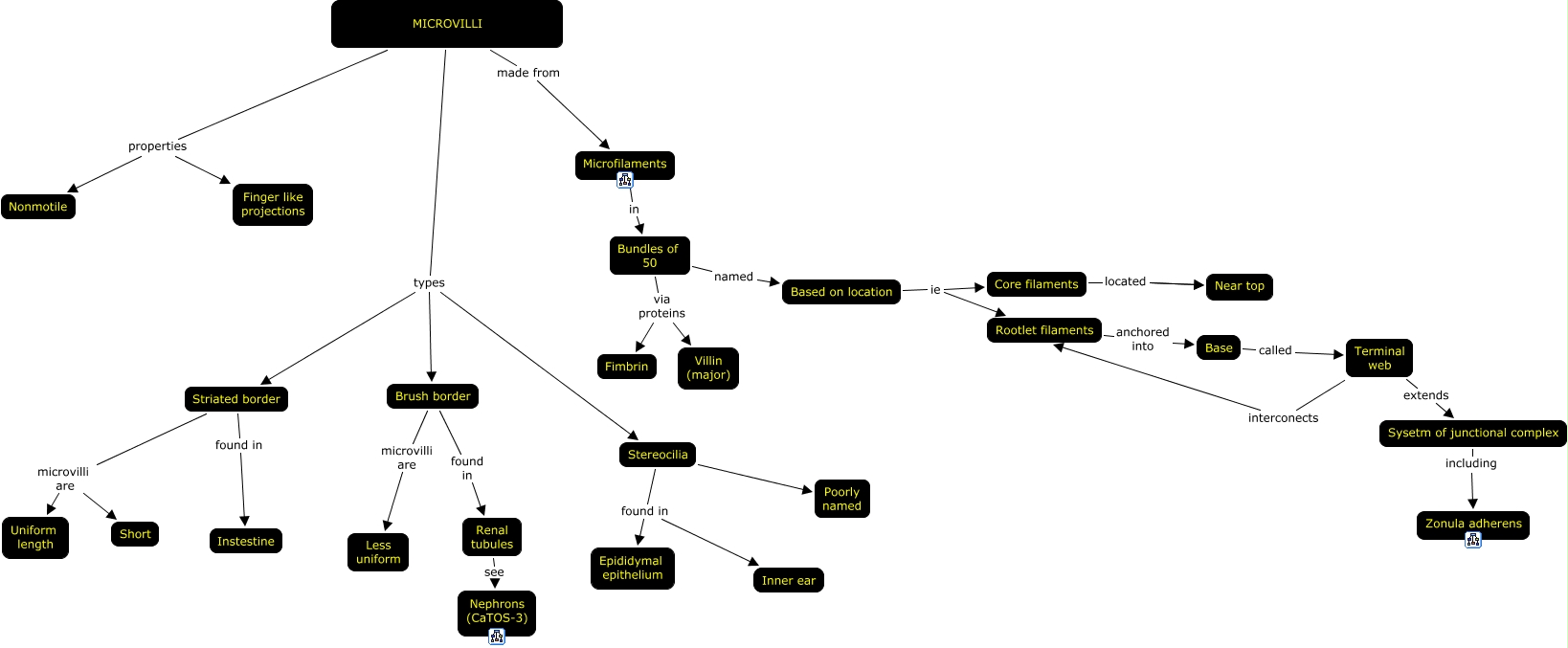 This Concept Map, created with IHMC CmapTools, has information related to: 21. Microvilli, MICROVILLI properties Nonmotile, Core filaments located Near top, Stereocilia found in Inner ear, MICROVILLI made from Microfilaments, Bundles of 50 named Based on location, Sysetm of junctional complex including Zonula adherens, MICROVILLI types Stereocilia, MICROVILLI properties Finger like projections, Stereocilia found in Epididymal epithelium, Striated border microvilli are Short, Rootlet filaments anchored into Base, Based on location ie Core filaments, Brush border microvilli are Less uniform, Terminal web interconects Rootlet filaments, Striated border microvilli are Uniform length, Brush border found in Renal tubules, Stereocilia Poorly named, Bundles of 50 via proteins Fimbrin, Microfilaments in Bundles of 50, Core filaments located Near top