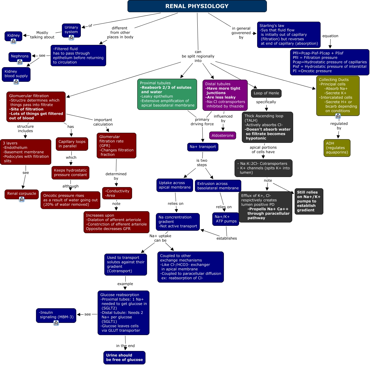 This Concept Map, created with IHMC CmapTools, has information related to: 29e. Renal Physiology, Extrusion across basolateral membrane relies on Na+/K+ ATP pumps, Capillary loops in parallel which Keeps hydrostatic pressure constant, Na concrentration gradient -Not active transport Na+ uptake can be Coupled to other exchange mechanisms -Like Cl-/HCO3- exchanger in apical membrane -Coupled to paracellular diffusion ex: reabsorption of Cl-, Glucose reabsorption -Proximal tubes: 1 Na+ needed to get glucose in (SGLT2) -Distal tubule: Needs 2 Na+ per glucose (SGLT1) -Glucose leaves cells via GLUT transporter see -Insulin signaling (MBM-3), -Conductivity -Area note Increases upon -Dialation of afferent arteriole -Constriction of efferent arteriole Opposite decreases GFR, Loop of Henle specifically Thick Ascending loop (TALH) -Actively absorbs Cl- -Doesn't absorb water so filtrate becomes hypotonic, Na concrentration gradient -Not active transport Na+ uptake can be Used to transport solutes against their gradient (Cotransport), Glomerular filtration rate (GFR) -Changes filtration fraction determined by -Conductivity -Area, RENAL PHYSIOLOGY can be split regionally into Loop of Henle, Proximal tubules -Reabsorb 2/3 of solutes and water -Leaky epithelium -Extensive amplification of apical basolateral membrane primary driving force Na+ transport, RENAL PHYSIOLOGY in general goverened by Starling's law -Sys that fluid flow is initially out of capillary (filtration) but reverses at end of capillary (absorption), Glomuerular filtration -Structre determines which things pass into filtrate -Site of filtration -Lots of things get filtered out of blood has Capillary loops in parallel, RENAL PHYSIOLOGY can be split regionally into Glomuerular filtration -Structre determines which things pass into filtrate -Site of filtration -Lots of things get filtered out of blood, Distal tubules -Have more tight junctions -Are less leaky -Na:Cl cotransporters inhibited by thiazide influenced by Aldosterone, Distal tubules -Have more tight junctions -Are less leaky -Na:Cl cotransporters inhibited by thiazide primary driving force Na+ transport, Na+/K+ ATP pumps establishes Na concrentration gradient -Not active transport, Glucose reabsorption -Proximal tubes: 1 Na+ needed to get glucose in (SGLT2) -Distal tubule: Needs 2 Na+ per glucose (SGLT1) -Glucose leaves cells via GLUT transporter in the end Urine should be free of glucose, - Na:K:2Cl- Cotransporters - K+ channels (spits K+ into lumen) note Still relies on Na+/K+ pumps to establish gradient, Urinary system Mostly talking about Kidney, RENAL PHYSIOLOGY can be split regionally into Distal tubules -Have more tight junctions -Are less leaky -Na:Cl cotransporters inhibited by thiazide