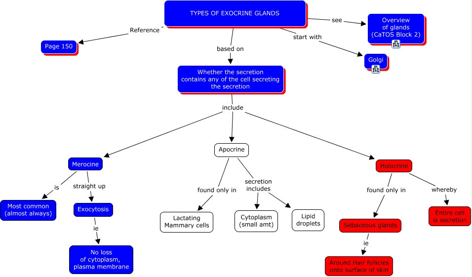 This Concept Map, created with IHMC CmapTools, has information related to: 16. Funcitnoal Classifications of Exocrine Glands, TYPES OF EXOCRINE GLANDS Reference Page 150, TYPES OF EXOCRINE GLANDS based on Whether the secretion contains any of the cell secreting the secretion, Merocine is Most common (almost always), Whether the secretion contains any of the cell secreting the secretion include Apocrine, Apocrine found only in Lactating Mammary cells, Apocrine secretion includes Lipid droplets, Holocrine found only in Sebaceous glands, TYPES OF EXOCRINE GLANDS see Overview of glands (CaTOS Block 2), Whether the secretion contains any of the cell secreting the secretion include Holocrine, Exocytosis ie No loss of cytoplasm, plasma membrane, Apocrine secretion includes Cytoplasm (small amt), Merocine straight up Exocytosis, TYPES OF EXOCRINE GLANDS start with Golgi, Whether the secretion contains any of the cell secreting the secretion include Merocine, Sebaceous glands ie Around Hair follicles onto surface of skin, Holocrine whereby Entire cell is secretion