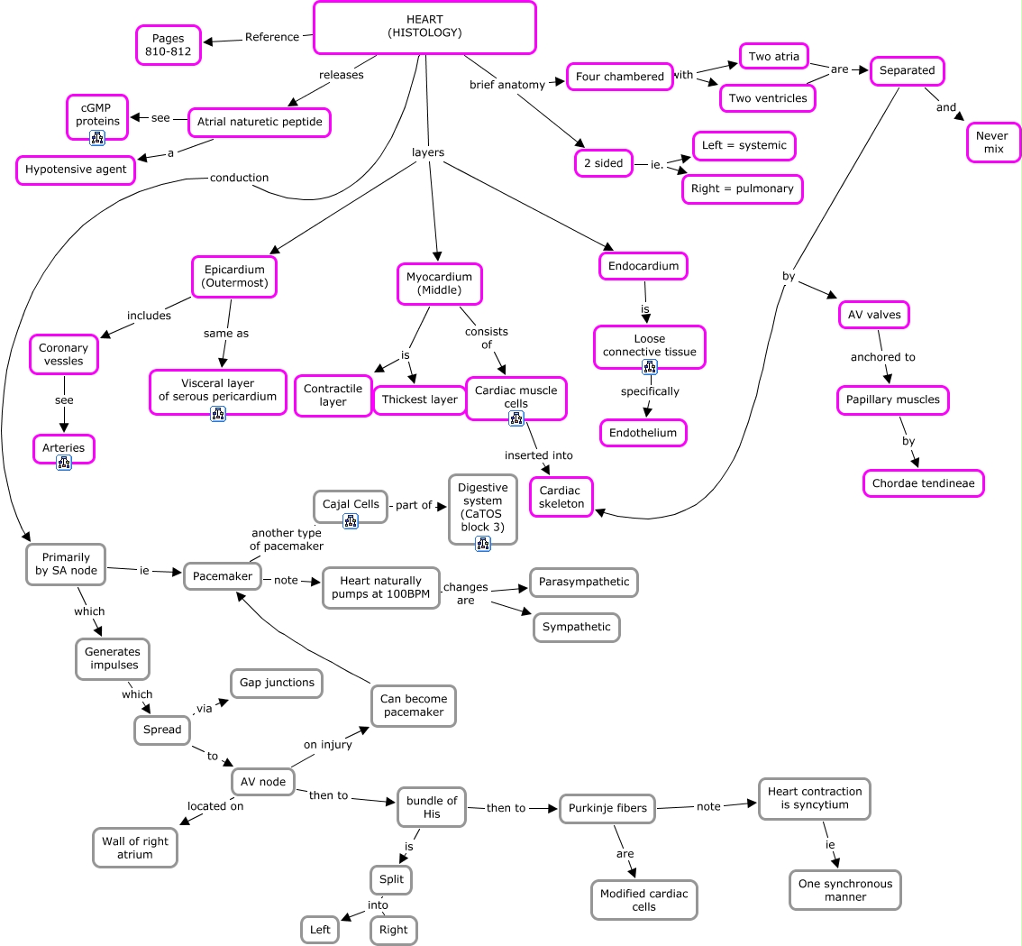 This Concept Map, created with IHMC CmapTools, has information related to: 34. Heart, AV node located on Wall of right atrium, Atrial naturetic peptide a Hypotensive agent, Primarily by SA node ie Pacemaker, HEART (HISTOLOGY) Reference Pages 810-812, AV valves anchored to Papillary muscles, 2 sided ie. Right = pulmonary, Pacemaker another type of pacemaker Cajal Cells, Heart naturally pumps at 100BPM changes are Parasympathetic, Heart naturally pumps at 100BPM changes are Sympathetic, Coronary vessles see Arteries, Four chambered with Two atria, Myocardium (Middle) is Thickest layer, Myocardium (Middle) consists of Cardiac muscle cells, bundle of His is Split, Epicardium (Outermost) includes Coronary vessles, AV node then to bundle of His, AV node on injury Can become pacemaker, HEART (HISTOLOGY) layers Myocardium (Middle), Split into Right, Two ventricles are Separated