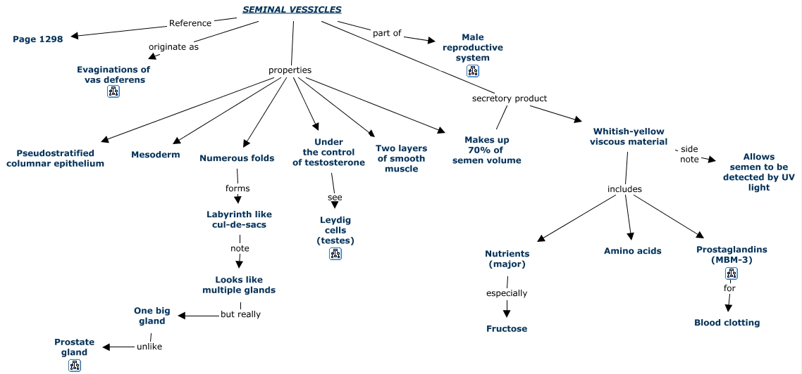 This Concept Map, created with IHMC CmapTools, has information related to: 31f. Seminal Vessicles, Under the control of testosterone see Leydig cells (testes), Makes up 70% of semen volume secretory product Whitish-yellow viscous material, Whitish-yellow viscous material includes Amino acids, Nutrients (major) especially Fructose, SEMINAL VESSICLES properties Pseudostratified columnar epithelium, Whitish-yellow viscous material includes Nutrients (major), SEMINAL VESSICLES properties Under the control of testosterone, One big gland unlike Prostate gland, Prostaglandins (MBM-3) for Blood clotting, Labyrinth like cul-de-sacs note Looks like multiple glands, Looks like multiple glands but really One big gland, Numerous folds forms Labyrinth like cul-de-sacs, SEMINAL VESSICLES properties Mesoderm, Whitish-yellow viscous material side note Allows semen to be detected by UV light, SEMINAL VESSICLES properties Numerous folds, SEMINAL VESSICLES properties Makes up 70% of semen volume, SEMINAL VESSICLES originate as Evaginations of vas deferens, Whitish-yellow viscous material includes Prostaglandins (MBM-3), SEMINAL VESSICLES properties Two layers of smooth muscle, SEMINAL VESSICLES secretory product Whitish-yellow viscous material