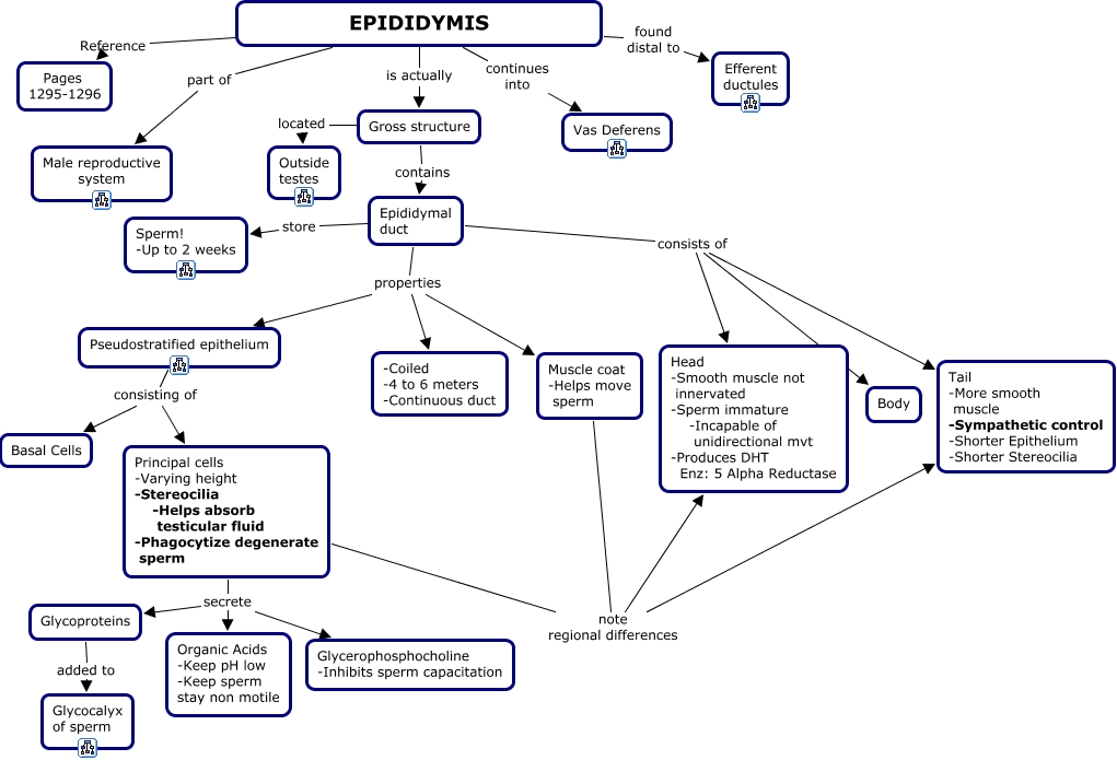 This Concept Map, created with IHMC CmapTools, has information related to: 31d. Epididymis, Epididymal duct properties Muscle coat -Helps move sperm, Epididymal duct consists of Body, Principal cells -Varying height -Stereocilia -Helps absorb testicular fluid -Phagocytize degenerate sperm secrete Glycoproteins, Principal cells -Varying height -Stereocilia -Helps absorb testicular fluid -Phagocytize degenerate sperm secrete Organic Acids -Keep pH low -Keep sperm stay non motile, Muscle coat -Helps move sperm note regional differences Head -Smooth muscle not innervated -Sperm immature -Incapable of unidirectional mvt -Produces DHT Enz: 5 Alpha Reductase, Glycoproteins added to Glycocalyx of sperm, Pseudostratified epithelium consisting of Principal cells -Varying height -Stereocilia -Helps absorb testicular fluid -Phagocytize degenerate sperm, EPIDIDYMIS part of Male reproductive system, Gross structure contains Epididymal duct, Principal cells -Varying height -Stereocilia -Helps absorb testicular fluid -Phagocytize degenerate sperm secrete Glycerophosphocholine -Inhibits sperm capacitation, Epididymal duct consists of Tail -More smooth muscle -Sympathetic control -Shorter Epithelium -Shorter Stereocilia, Epididymal duct store Sperm! -Up to 2 weeks, Principal cells -Varying height -Stereocilia -Helps absorb testicular fluid -Phagocytize degenerate sperm note regional differences Head -Smooth muscle not innervated -Sperm immature -Incapable of unidirectional mvt -Produces DHT Enz: 5 Alpha Reductase, Epididymal duct properties Pseudostratified epithelium, Principal cells -Varying height -Stereocilia -Helps absorb testicular fluid -Phagocytize degenerate sperm note regional differences Tail -More smooth muscle -Sympathetic control -Shorter Epithelium -Shorter Stereocilia, EPIDIDYMIS is actually Gross structure, Pseudostratified epithelium consisting of Basal Cells, Gross structure located Outside testes, EPIDIDYMIS continues into Vas Deferens, Epididymal duct consists of Head -Smooth muscle not innervated -Sperm immature -Incapable of unidirectional mvt -Produces DHT Enz: 5 Alpha Reductase