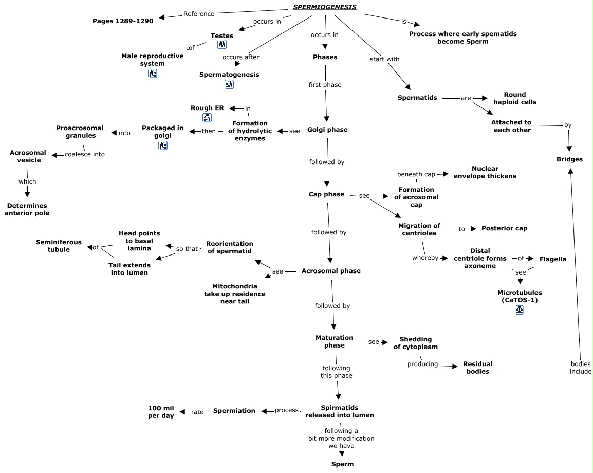 This Concept Map, created with IHMC CmapTools, has information related to: 31a2. Spermiogenesis, Spirmatids released into lumen following a bit more modification we have Sperm, Maturation phase following this phase Spirmatids released into lumen, Spermiation rate 100 mil per day, Proacrosomal granules coalesce into Acrosomal vesicle, Flagella see Microtubules (CaTOS-1), SPERMIOGENESIS occurs in Phases, Acrosomal phase see Reorientation of spermatid, Spermatids are Attached to each other, SPERMIOGENESIS Reference Pages 1289-1290, SPERMIOGENESIS occurs in Testes, Formation of hydrolytic enzymes then Packaged in golgi, Phases first phase Golgi phase, SPERMIOGENESIS is Process where early spematids become Sperm, Spermatids are Round haploid cells, Distal centriole forms axoneme see Microtubules (CaTOS-1), Acrosomal phase see Mitochondria take up residence near tail, Reorientation of spermatid so that Head points to basal lamina, Acrosomal vesicle which Determines anterior pole, Distal centriole forms axoneme of Flagella, Cap phase see Formation of acrosomal cap