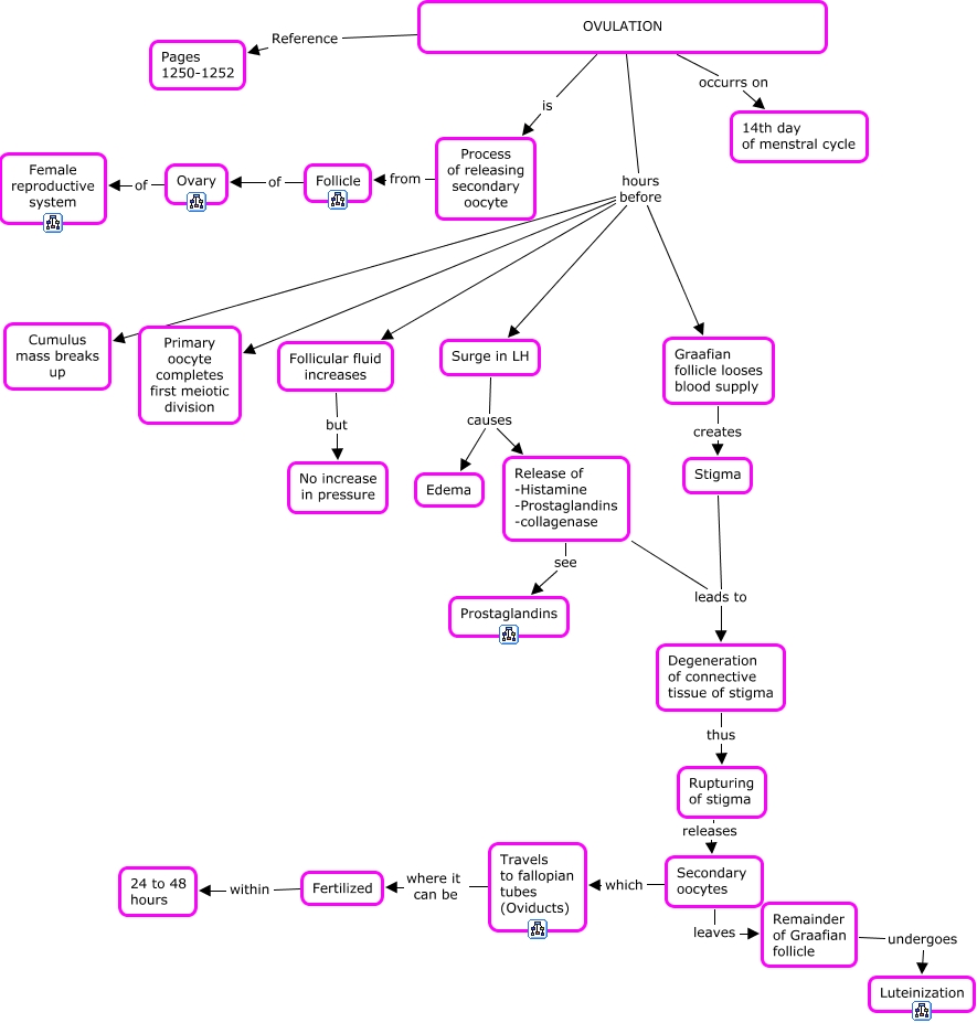 This Concept Map, created with IHMC CmapTools, has information related to: 30a2. Ovulation, Ovary of Female reproductive system, OVULATION hours before Cumulus mass breaks up, Remainder of Graafian follicle undergoes Luteinization, Follicular fluid increases but No increase in pressure, OVULATION hours before Follicular fluid increases, Stigma leads to Degeneration of connective tissue of stigma, Release of -Histamine -Prostaglandins -collagenase leads to Degeneration of connective tissue of stigma, OVULATION Reference Pages 1250-1252, Rupturing of stigma releases Secondary oocytes, Degeneration of connective tissue of stigma thus Rupturing of stigma, Surge in LH causes Release of -Histamine -Prostaglandins -collagenase, OVULATION occurrs on 14th day of menstral cycle, Graafian follicle looses blood supply creates Stigma, OVULATION hours before Primary oocyte completes first meiotic division, Surge in LH causes Edema, OVULATION hours before Surge in LH, Secondary oocytes which Travels to fallopian tubes (Oviducts), Fertilized within 24 to 48 hours, Travels to fallopian tubes (Oviducts) where it can be Fertilized, Release of -Histamine -Prostaglandins -collagenase see Prostaglandins