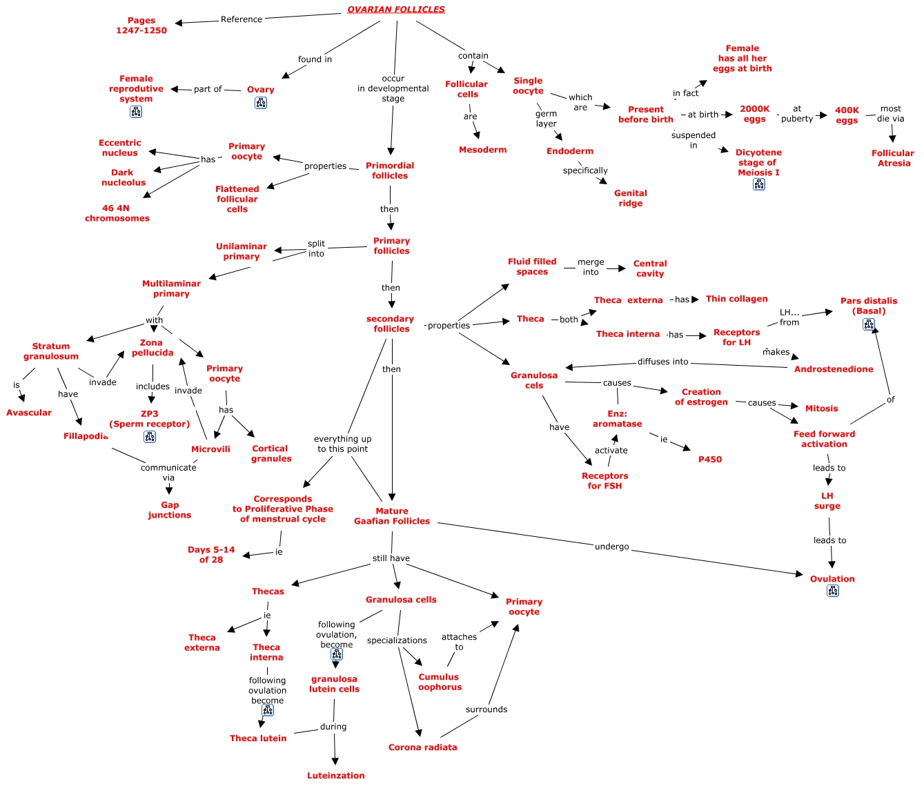 This Concept Map, created with IHMC CmapTools, has information related to: 30a1. Ovarian Follicles, Creation of estrogen causes Feed forward activation, Zona pellucida includes ZP3 (Sperm receptor), secondary follicles properties Granulosa cels, Corona radiata surrounds Primary oocyte, Androstenedione diffuses into Granulosa cels, Microvili communicate via Gap junctions, Fluid filled spaces merge into Central cavity, Primordial follicles properties Primary oocyte, Multilaminar primary with Stratum granulosum, Present before birth in fact Female has all her eggs at birth, Single oocyte germ layer Endoderm, secondary follicles then Mature Gaafian Follicles, Theca interna following ovulation become Theca lutein, Multilaminar primary with Primary oocyte, Theca both Theca externa, Enz: aromatase ie P450, OVARIAN FOLLICLES found in Ovary, Primary follicles then secondary follicles, secondary follicles properties Fluid filled spaces, Mature Gaafian Follicles undergo Ovulation