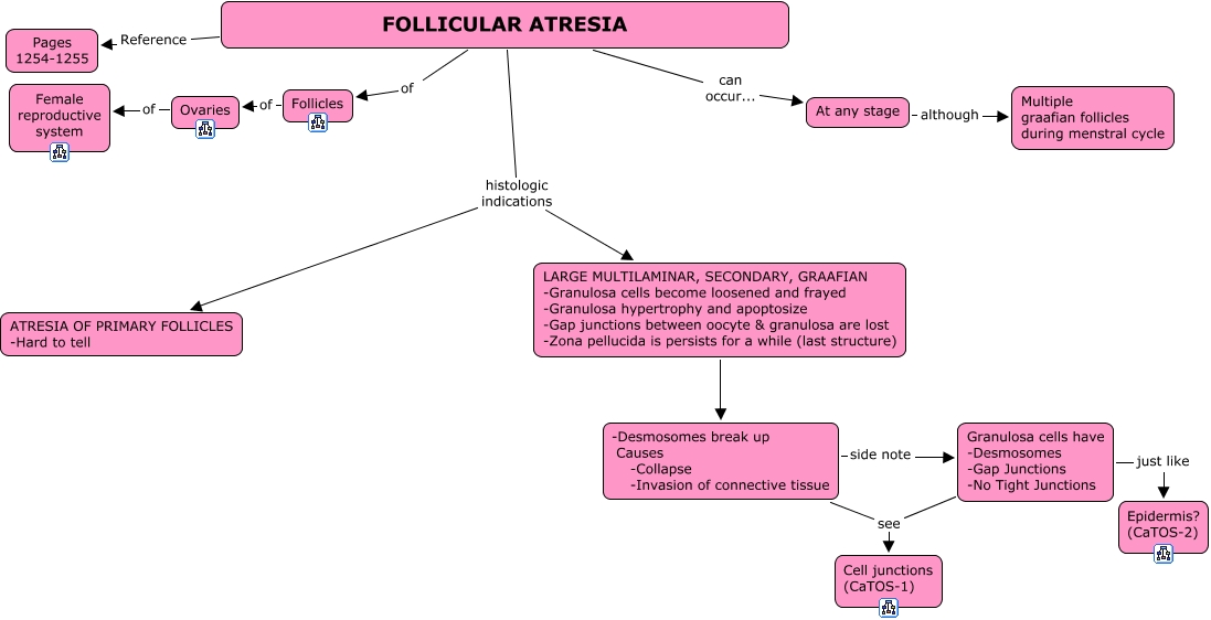 This Concept Map, created with IHMC CmapTools, has information related to: 30a4. Follicular Atresia, At any stage although Multiple graafian follicles during menstral cycle, FOLLICULAR ATRESIA can occur... At any stage, Ovaries of Female reproductive system, FOLLICULAR ATRESIA histologic indications LARGE MULTILAMINAR, SECONDARY, GRAAFIAN -Granulosa cells become loosened and frayed -Granulosa hypertrophy and apoptosize -Gap junctions between oocyte & granulosa are lost -Zona pellucida is persists for a while (last structure), -Desmosomes break up Causes -Collapse -Invasion of connective tissue side note Granulosa cells have -Desmosomes -Gap Junctions -No Tight Junctions, Follicles of Ovaries, -Desmosomes break up Causes -Collapse -Invasion of connective tissue see Cell junctions (CaTOS-1), FOLLICULAR ATRESIA of Follicles, FOLLICULAR ATRESIA Reference Pages 1254-1255, Granulosa cells have -Desmosomes -Gap Junctions -No Tight Junctions just like Epidermis? (CaTOS-2), FOLLICULAR ATRESIA histologic indications ATRESIA OF PRIMARY FOLLICLES -Hard to tell, LARGE MULTILAMINAR, SECONDARY, GRAAFIAN -Granulosa cells become loosened and frayed -Granulosa hypertrophy and apoptosize -Gap junctions between oocyte & granulosa are lost -Zona pellucida is persists for a while (last structure) -Desmosomes break up Causes -Collapse -Invasion of connective tissue, Granulosa cells have -Desmosomes -Gap Junctions -No Tight Junctions see Cell junctions (CaTOS-1)