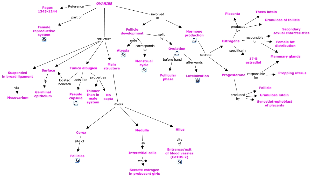 This Concept Map, created with IHMC CmapTools, has information related to: 30a. Ovaries, Follicle development corresponds to Menstrual cycle, Progesterone responsible for Mammary glands, Estrogens responsible for Secondary sexual charcteristics, OVARIES structure Main structure, OVARIES structure Tunica albugiea, Follicle development split by Ovulation, Tunica albugiea located beneath Surface, Main structure layers Medulla, Progesterone responsible for Prepping uterus, Follicle development note Atresia, Suspended in broad ligament via Mesovarium, OVARIES structure Suspended in broad ligament, Hormone production secrete Progesterone, Hormone production secrete Estrogens, Corex site of Follicles, Progesterone produced by Syncytiotrophoblast of placenta, Estrogens produced by Theca lutein, OVARIES structure Surface, Hilus site of Entrance/exit of blood vessles (CaTOS 2), Tunica albugiea acts like Pseudo capsule