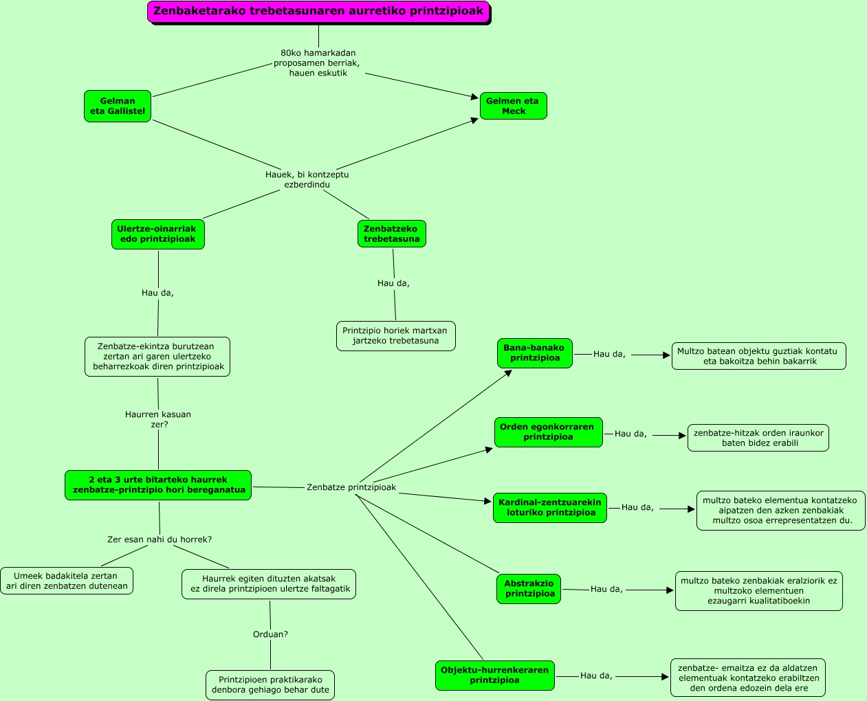 Este mapa conceptual tiene información relacionada a: Zenbaketarako aurretiko printzipioak, Objektu-hurrenkeraren printzipioa Hau da, zenbatze- emaitza ez da aldatzen elementuak kontatzeko erabiltzen den ordena edozein dela ere, Abstrakzio printzipioa Zenbatze printzipioak Objektu-hurrenkeraren printzipioa, Ulertze-oinarriak edo printzipioak Hau da, Zenbatze-ekintza burutzean zertan ari garen ulertzeko beharrezkoak diren printzipioak, 2 eta 3 urte bitarteko haurrek zenbatze-printzipio hori bereganatua Zenbatze printzipioak Objektu-hurrenkeraren printzipioa, Gelman eta Gallistel Hauek, bi kontzeptu ezberdindu Gelmen eta Meck, Gelman eta Gallistel 80ko hamarkadan proposamen berriak, hauen eskutik Gelmen eta Meck, Zenbaketarako trebetasunaren aurretiko printzipioak 80ko hamarkadan proposamen berriak, hauen eskutik Gelmen eta Meck, Gelman eta Gallistel Hauek, bi kontzeptu ezberdindu Ulertze-oinarriak edo printzipioak, 2 eta 3 urte bitarteko haurrek zenbatze-printzipio hori bereganatua Zenbatze printzipioak Bana-banako printzipioa, Bana-banako printzipioa Hau da, Multzo batean objektu guztiak kontatu eta bakoitza behin bakarrik