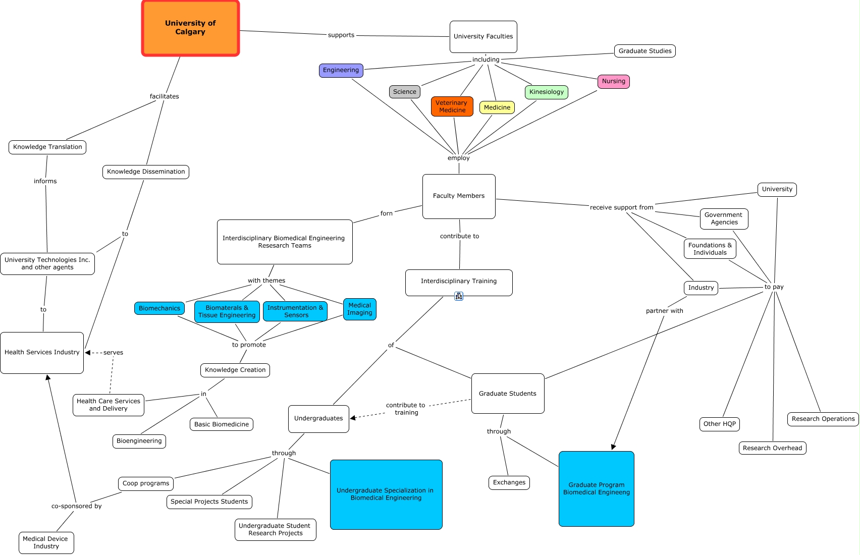 This Concept Map, created with IHMC CmapTools, has information related to: UofC Biomedical Engineering Initiative_4, Faculty Members receive support from Foundations & Individuals, Coop programs co-sponsored by Health Services Industry, Undergraduates through Special Projects Students, Government Agencies to pay Graduate Students, Faculty Members receive support from Government Agencies, University Faculties including Nursing, Faculty Members receive support from Industry, University to pay Graduate Students, Undergraduates through Coop programs, Graduate Program Biomedical Engineeng through Graduate Students, Knowledge Creation in Health Care Services and Delivery, Coop programs co-sponsored by Medical Device Industry, Kinesiology employ Science, Foundations & Individuals to pay Research Operations, Instrumentation & Sensors to promote Biomaterals & Tissue Engineering, University Faculties including Kinesiology, Industry to pay Other HQP, Interdisciplinary Training of Undergraduates, University Faculties including Science, Government Agencies to pay Research Overhead