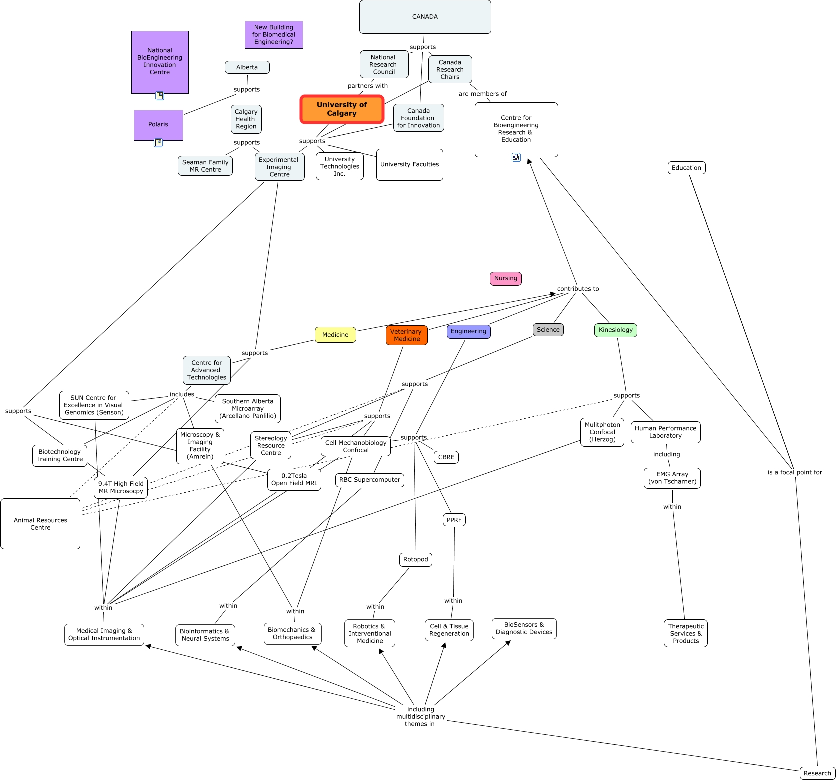 This Concept Map, created with IHMC CmapTools, has information related to: UofC Biomedical Engineering Initiative_Infrastructure, Medicine contributes to Kinesiology, National Research Council partners with University of Calgary, CANADA supports Canada Foundation for Innovation, EMG Array (von Tscharner) within Therapeutic Services & Products, Centre for Advanced Technologies includes SUN Centre for Excellence in Visual Genomics (Senson), Research including multidisciplinary themes in BioSensors & Diagnostic Devices, Veterinary Medicine supports 0.2Tesla Open Field MRI, Engineering contributes to Centre for Bioengineering Research & Education, Research including multidisciplinary themes in Bioinformatics & Neural Systems, Rotopod within Robotics & Interventional Medicine, Medicine contributes to Centre for Bioengineering Research & Education, Centre for Advanced Technologies includes Microscopy & Imaging Facility (Amrein), Southern Alberta Microarray (Arcellano-Panlilio) includes Microscopy & Imaging Facility (Amrein), Canada Research Chairs supports University Technologies Inc., Research including multidisciplinary themes in Biomechanics & Orthopaedics, Engineering supports CBRE, Kinesiology supports Animal Resources Centre, Alberta supports Polaris, Southern Alberta Microarray (Arcellano-Panlilio) includes SUN Centre for Excellence in Visual Genomics (Senson), Canada Foundation for Innovation supports Experimental Imaging Centre