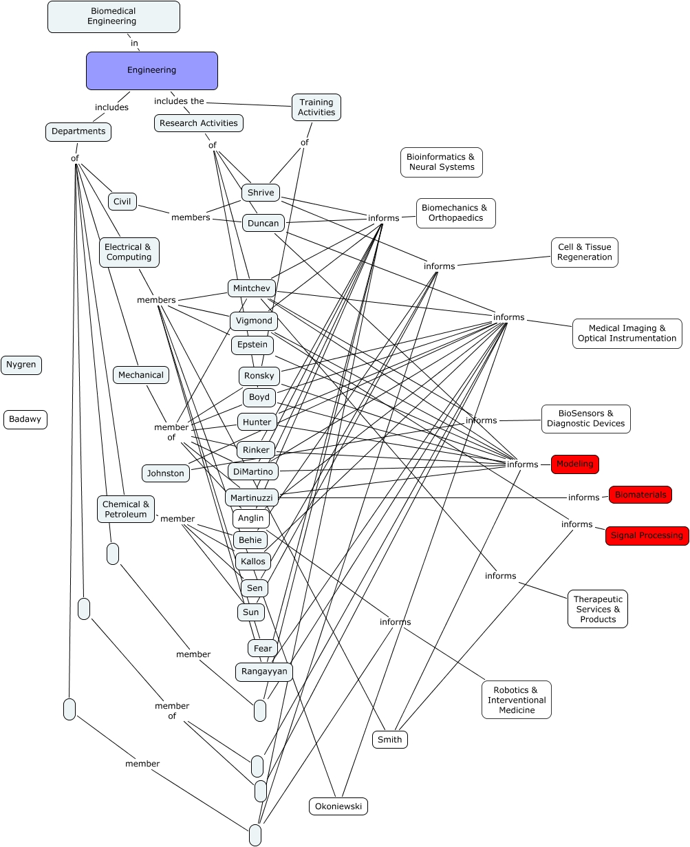 This Concept Map, created with IHMC CmapTools, has information related to: Engineering, Martinuzzi informs, informs Medical Imaging & Optical Instrumentation, Johnston informs Boyd, Smith informs Signal Processing, Martinuzzi informs Rangayyan, Mechanical member of Ronsky, Mintchev informs Modeling, Electrical & Computing members Vigmond, Electrical & Computing members Epstein, Kallos informs Hunter, informs Mintchev, Mintchev informs Therapeutic Services & Products, Mintchev informs Biomechanics & Orthopaedics, Civil members Shrive, Vigmond informs Rangayyan, Okoniewski informs Hunter, Martinuzzi informs Biomechanics & Orthopaedics, Duncan informs Boyd, informs Hunter, Chemical & Petroleum member Sen
