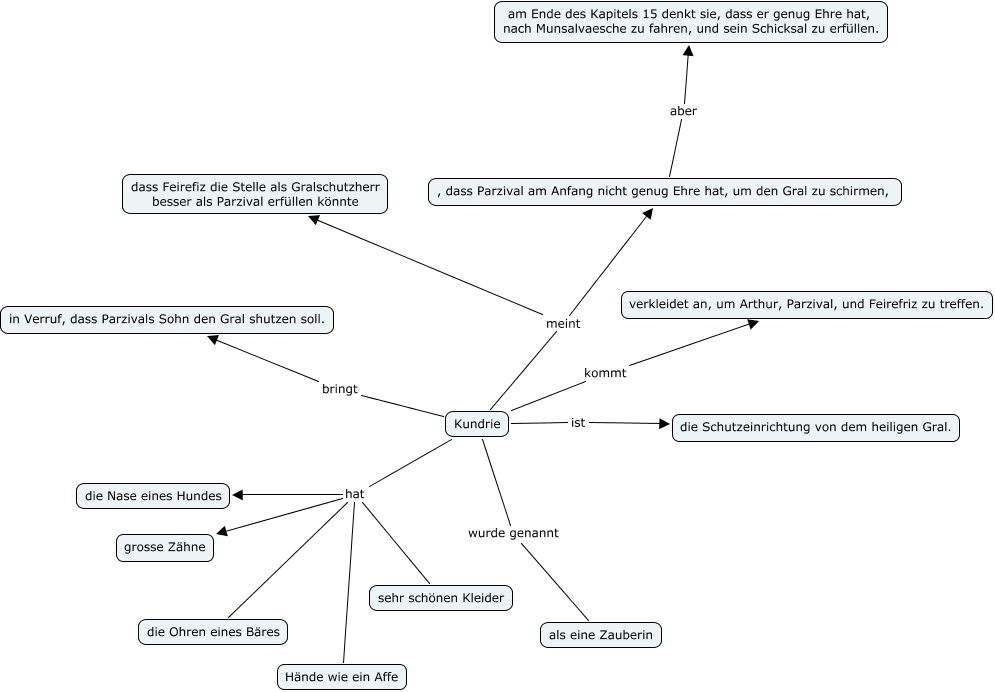 This Concept Map, created with IHMC CmapTools, has information related to: Cundrie, Kundrie hat sehr schönen Kleider, Kundrie hat die Ohren eines Bäres, Kundrie wurde genannt als eine Zauberin, Kundrie hat die Nase eines Hundes, Kundrie kommt verkleidet an, um Arthur, Parzival, und Feirefriz zu treffen., Kundrie meint , dass Parzival am Anfang nicht genug Ehre hat, um den Gral zu schirmen,, , dass Parzival am Anfang nicht genug Ehre hat, um den Gral zu schirmen, aber am Ende des Kapitels 15 denkt sie, dass er genug Ehre hat, nach Munsalvaesche zu fahren, und sein Schicksal zu erfüllen., Kundrie hat Hände wie ein Affe, Kundrie hat grosse Zähne, Kundrie meint dass Feirefiz die Stelle als Gralschutzherr besser als Parzival erfüllen könnte, Kundrie bringt in Verruf, dass Parzivals Sohn den Gral shutzen soll., Kundrie ist die Schutzeinrichtung von dem heiligen Gral.
