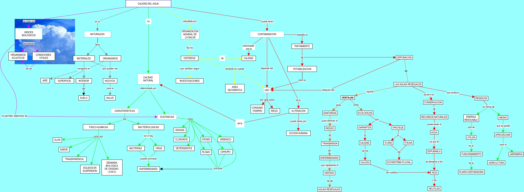 Este Cmap, tiene información relacionada con: CALIDAD DEL AGUA, APROVECHAR para la AGRICULTURA, LAS AGUAS RESIDUALES reporta VENTAJAS, CALIDAD DEL AGUA se mide con INDICES BIOLOGICOS, CONSERVACION de RECURSOS NATURALES, VIRUS pueden provocar ENFERMEDADES, ABONO que se puede APROVECHAR, BACTERIOLOGICAS ver si hay VIRUS, CONDICIONES VITALES de los ORGANSIMOS ACUATICOS, RESIDUOS en forma de ENERGIA RENOVABLE, ORGANSIMOS recogidos en SUPERFICIE, CALIDAD DEL AGUA puede tener CONTAMINACION, CRITERIOS teniendo en cuenta AREA GEOGRAFICA, CALIDAD NATURAL determinada por CARASTERISTICAS, USO con usos como CONSUMO HUMANO, SUSTANCIAS como DETERGENTES, TRATAMIENTO de DEPURACION, DEPURARLA se devuelve a los RIOS, CALIDAD de los CAUCES, ORGANSIMOS recogidos en AIRE, CALIDAD DEL AGUA en la NATURALEZA