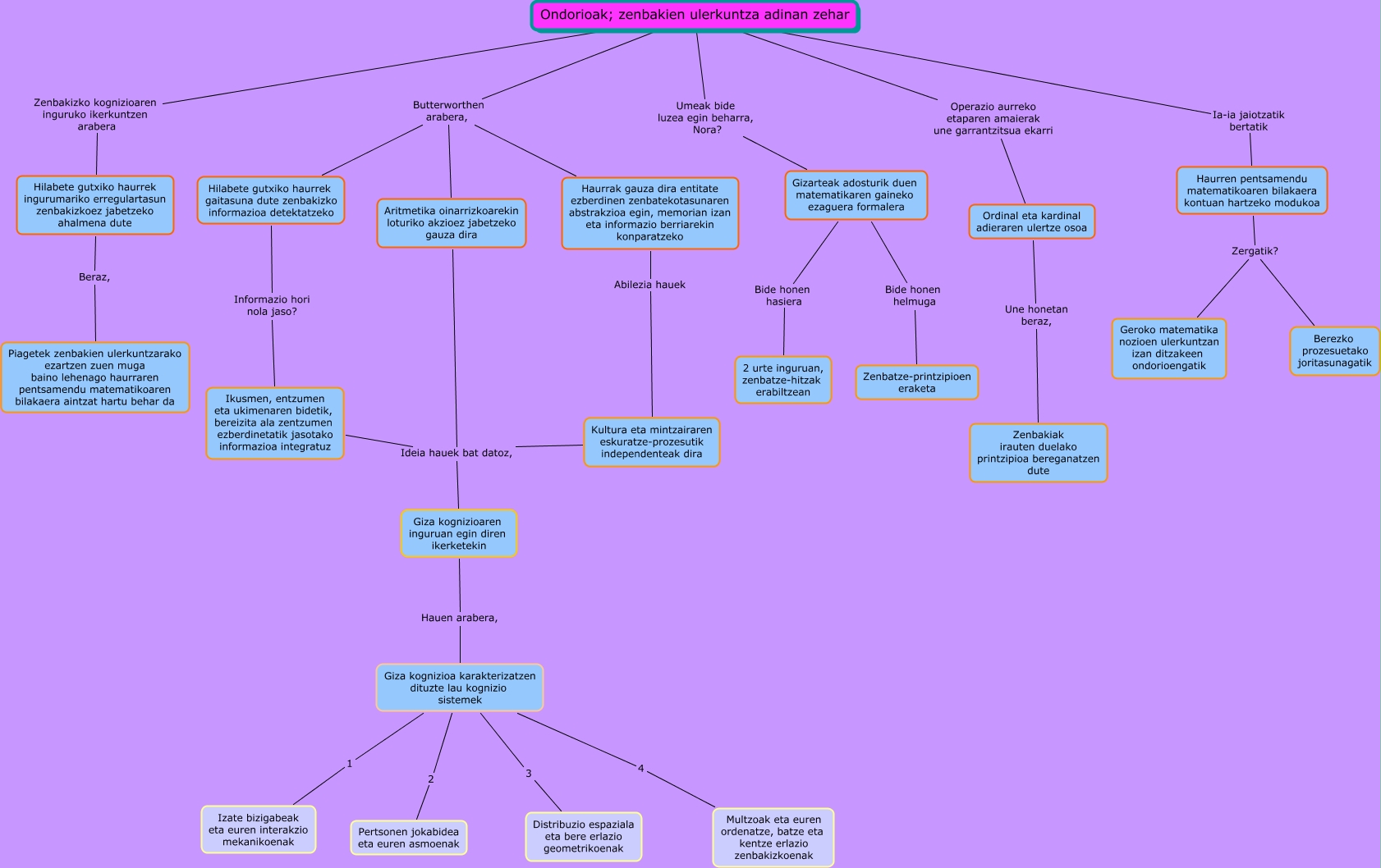 Este mapa conceptual tiene información relacionada a: Ondorioak, Aritmetika oinarrizkoarekin loturiko akzioez jabetzeko gauza dira Ideia hauek bat datoz, Giza kognizioaren inguruan egin diren ikerketekin, Haurren pentsamendu matematikoaren bilakaera kontuan hartzeko modukoa Zergatik? Geroko matematika nozioen ulerkuntzan izan ditzakeen ondorioengatik, Giza kognizioa karakterizatzen dituzte lau kognizio sistemek 3 Distribuzio espaziala eta bere erlazio geometrikoenak, Giza kognizioa karakterizatzen dituzte lau kognizio sistemek 2 Pertsonen jokabidea eta euren asmoenak, Ondorioak; zenbakien ulerkuntza adinan zehar Zenbakizko kognizioaren inguruko ikerkuntzen arabera Hilabete gutxiko haurrek ingurumariko erregulartasun zenbakizkoez jabetzeko ahalmena dute, Gizarteak adosturik duen matematikaren gaineko ezaguera formalera Bide honen hasiera 2 urte inguruan, zenbatze-hitzak erabiltzean, Ikusmen, entzumen eta ukimenaren bidetik, bereizita ala zentzumen ezberdinetatik jasotako informazioa integratuz Ideia hauek bat datoz, Giza kognizioaren inguruan egin diren ikerketekin, Ondorioak; zenbakien ulerkuntza adinan zehar Butterworthen arabera, Hilabete gutxiko haurrek gaitasuna dute zenbakizko informazioa detektatzeko, Kultura eta mintzairaren eskuratze-prozesutik independenteak dira Ideia hauek bat datoz, Giza kognizioaren inguruan egin diren ikerketekin, Ondorioak; zenbakien ulerkuntza adinan zehar Butterworthen arabera, Haurrak gauza dira entitate ezberdinen zenbatekotasunaren abstrakzioa egin, memorian izan eta informazio berriarekin konparatzeko
