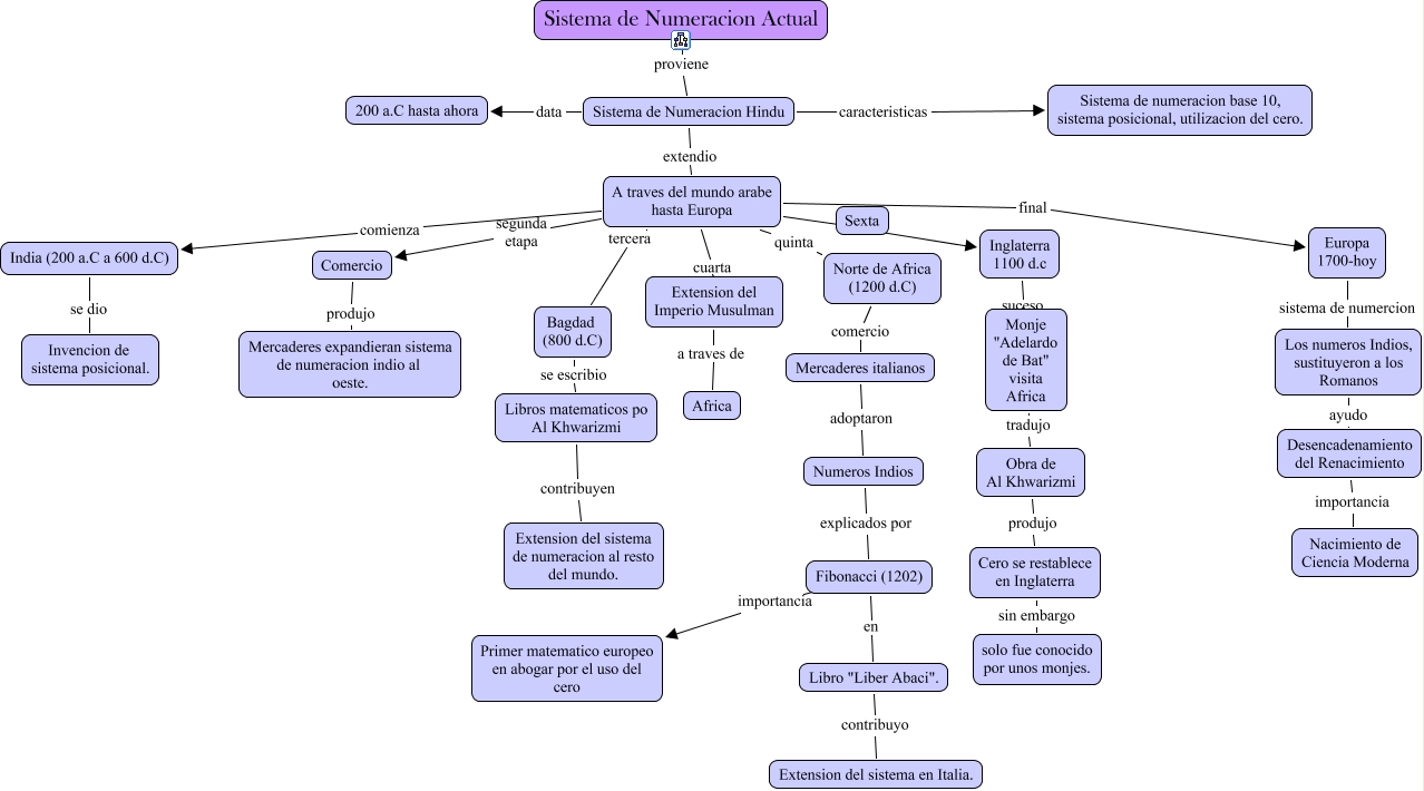 Este Cmap, tiene información relacionada con: Sistema de Numeracion Actual, Desencadenamiento del Renacimiento importancia Nacimiento de Ciencia Moderna, Cero se restablece en Inglaterra sin embargo solo fue conocido por unos monjes., Inglaterra 1100 d.c suceso Monje ''Adelardo de Bat" visita Africa, Numeros Indios explicados por Fibonacci (1202), A traves del mundo arabe hasta Europa tercera Bagdad (800 d.C), Libros matematicos po Al Khwarizmi contribuyen Extension del sistema de numeracion al resto del mundo., Extension del Imperio Musulman a traves de Africa, Obra de Al Khwarizmi produjo Cero se restablece en Inglaterra, A traves del mundo arabe hasta Europa segunda etapa Comercio, Monje ''Adelardo de Bat" visita Africa tradujo Obra de Al Khwarizmi, Mercaderes italianos adoptaron Numeros Indios, A traves del mundo arabe hasta Europa quinta Norte de Africa (1200 d.C), India (200 a.C a 600 d.C) se dio Invencion de sistema posicional., Comercio produjo Mercaderes expandieran sistema de numeracion indio al oeste., Libro "Liber Abaci". contribuyo Extension del sistema en Italia., Europa 1700-hoy sistema de numercion Los numeros Indios, sustituyeron a los Romanos, A traves del mundo arabe hasta Europa final Europa 1700-hoy, Bagdad (800 d.C) se escribio Libros matematicos po Al Khwarizmi, Sistema de Numeracion Hindu data 200 a.C hasta ahora, Sistema de Numeracion Actual proviene Sistema de Numeracion Hindu