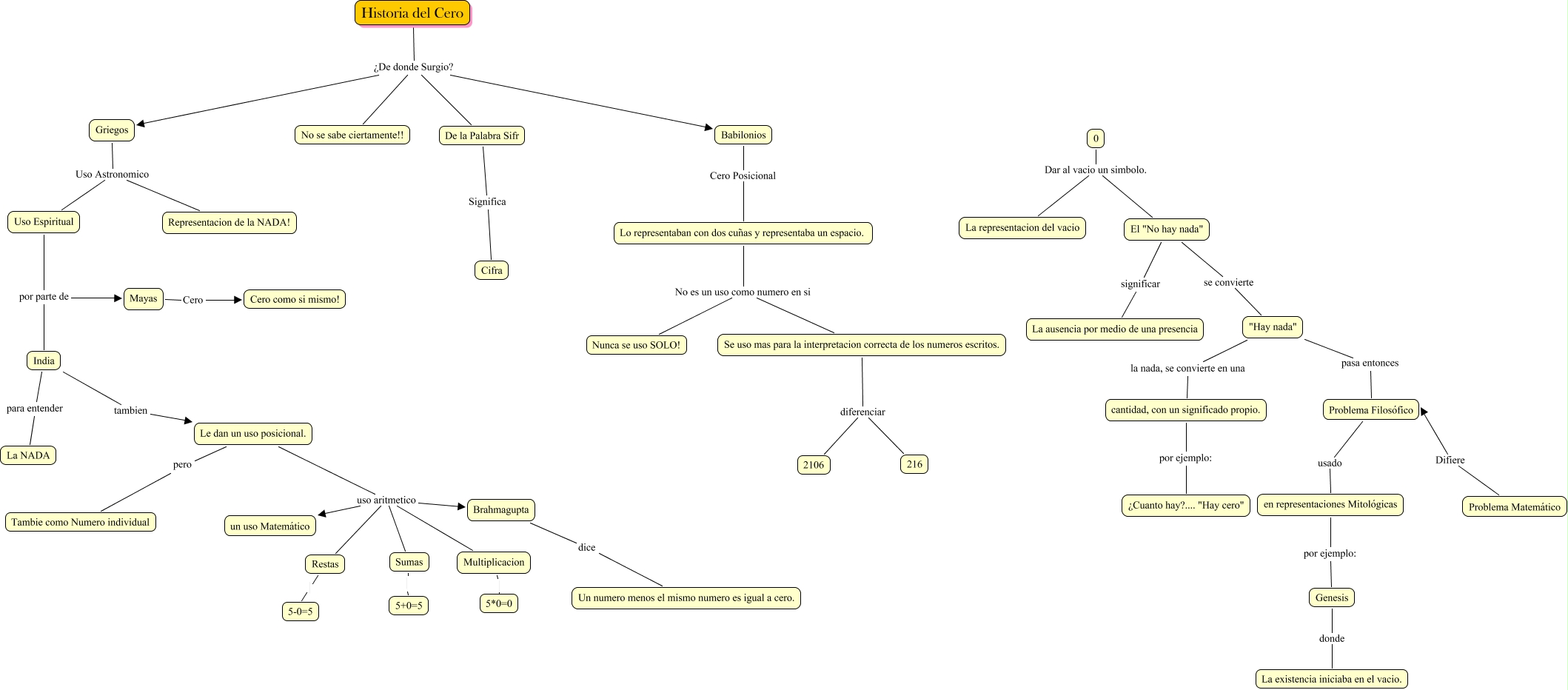 Este Cmap, tiene información relacionada con: Cero 2, Sumas 5+0=5, Problema Filosófico usado en representaciones Mitológicas, India tambien Le dan un uso posicional., Historia del Cero ¿De donde Surgio? Griegos, Se uso mas para la interpretacion correcta de los numeros escritos. diferenciar 2106, "Hay nada" pasa entonces Problema Filosófico, Historia del Cero ¿De donde Surgio? No se sabe ciertamente!!, cantidad, con un significado propio. por ejemplo: ¿Cuanto hay?.... "Hay cero", Le dan un uso posicional. pero Tambie como Numero individual, 0 Dar al vacio un simbolo. La representacion del vacio, Uso Espiritual por parte de Mayas, Griegos Uso Astronomico Representacion de la NADA!, Le dan un uso posicional. uso aritmetico un uso Matemático, 0 Dar al vacio un simbolo. El "No hay nada", El "No hay nada" significar La ausencia por medio de una presencia, Babilonios Cero Posicional Lo representaban con dos cuñas y representaba un espacio., en representaciones Mitológicas por ejemplo: Genesis, "Hay nada" la nada, se convierte en una cantidad, con un significado propio., Le dan un uso posicional. uso aritmetico Restas, Le dan un uso posicional. uso aritmetico Brahmagupta