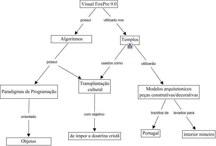 Esse mapa conceitual, produzido no IHMC CmapTools, tem a informação relacionada a: Ensino de Linguagem de Programação, Algoritmos possui Paradigmas de Programação, Visual FoxPro 9.0 possui Algoritmos, Templos usados como Transplantação cultural, Visual FoxPro 9.0 utilizado nos Templos, Algoritmos possui Transplantação cultural, Modelos arquitetonicos peças construtivas/decorativas trazidos de Portugal, Modelos arquitetonicos peças construtivas/decorativas levados para interior mineiro, Templos utilizarão Modelos arquitetonicos peças construtivas/decorativas, Paradigmas de Programação orientado Objetos, Transplantação cultural com objetivo de impor a doutrina cristã