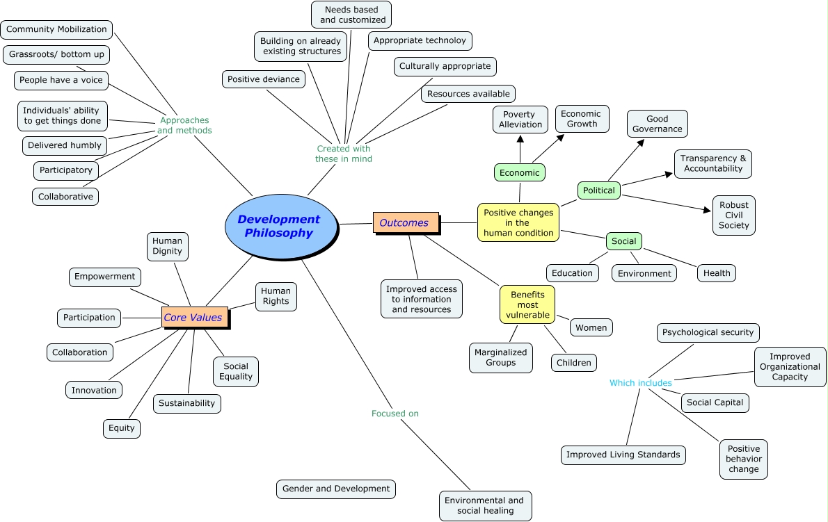 This Concept Map, created with IHMC CmapTools, has information related to: Shana Kirsch philosophy, Development Philosophy Outcomes, Social Positive changes in the human condition, Development Philosophy Created with these in mind Positive deviance, Development Philosophy Approaches and methods Grassroots/ bottom up, Economic Poverty Alleviation, Positive changes in the human condition Economic, Participation Core Values, Psychological security Which includes Improved Living Standards, Social Equality Core Values, Development Philosophy Approaches and methods Community Mobilization, Equity Core Values, Needs based and customized Created with these in mind Culturally appropriate, Political Transparency & Accountability, Empowerment Core Values, Development Philosophy Approaches and methods Individuals' ability to get things done, Needs based and customized Created with these in mind Building on already existing structures, Core Values Development Philosophy, Development Philosophy Created with these in mind Building on already existing structures, Development Philosophy Approaches and methods Participatory, Needs based and customized Created with these in mind Appropriate technoloy