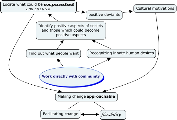 This Concept Map, created with IHMC CmapTools, has information related to: marja_sainio_philosophy, Facilitating change flexibility, Locate what could be expanded and created Making change approachable, Find out what people want Identify positive aspects of society and those which could become positive aspects, Locate what could be expanded and created positive deviants, Making change approachable flexibility, positive deviants Cultural motivations, Making change approachable Facilitating change, Cultural motivations Making change approachable, Recognizing innate human desires Identify positive aspects of society and those which could become positive aspects, Work directly with community Recognizing innate human desires, Identify positive aspects of society and those which could become positive aspects Locate what could be expanded and created, Work directly with community Find out what people want