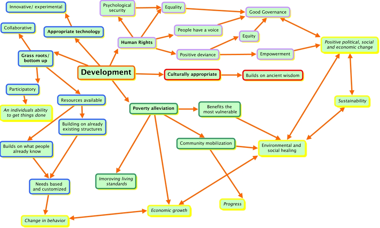 This Concept Map has information related to: Kallista Green Philosophy, Development Appropriate technology, Poverty alleviation Community mobilization, Community mobilization Progress, Appropriate technology Innovative/ experimental, Grass roots/ bottom up Participatory, Community mobilization Environmental and social healing, Needs based and customized Change in behavior, Poverty alleviation Benefits the most vulnerable, Development Culturally appropriate, Equity Good Governance